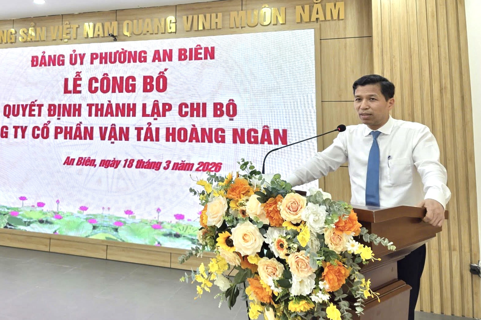 Trao Quyết định và tặng hoa cho Chi bộ Công ty Cổ phần vận tải Hoàng Ngân.Theo Quyết định của Đảng ủy phường An Biên, thành lập Chi bộ Công ty Cổ phần vận tải Hoàng Ngân với 4 đảng viên; đồng chí Mai Thị Nhung được chỉ định là Bí thư Chi bộ Công ty.