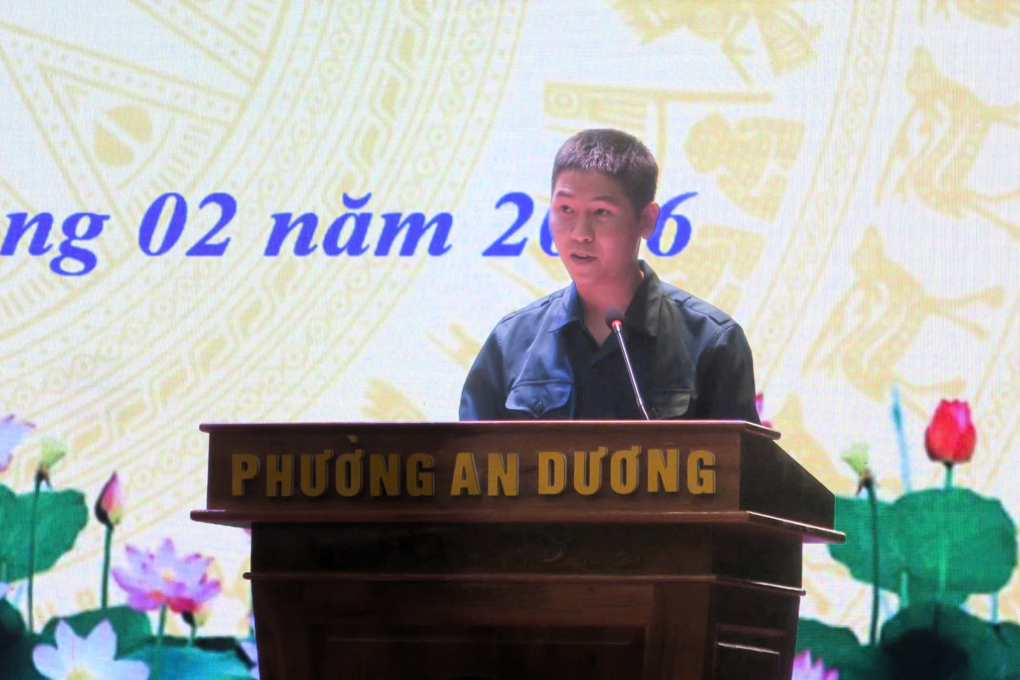 Tân binh Đồng Tấn Anh phát biểu.Đại diện các tân binh lên đường nhập ngũ đợt này, tân binh Đồng Tấn Anh cho biết: các tân binh nhận thức rõ lên đường nhập ngũ không chỉ là trách nhiệm của người công dân, mà còn là niềm tự hào của tuổi trẻ An Dương. Được khoác lên mình màu áo xanh lính, được rèn luyện trong môi trường quân ngũ là cơ hội để các thanh niên được trưởng thành hơn, sống có kỷ luật hơn, có lý tưởng trách nhiệm hơn với bản thân, gia đình và xã hội. Các tân binh hứa sẽ giữ vững phẩm chất tốt đẹp, cao quý, anh dũng bất khuât của người quân nhân cách mạng Việt Nam, chấp hành nghiêm chủ trương đường lối của Đảng, chính sách pháp luật của Nhà nước, kỷ luật Quân đội, quy định của đơn vị, ra sức tích cực học tập, rèn luyện, không ngừng phấn đấu, tu dưỡng nâng cao trình độ, chuyên môn nghiệp vụ, rèn luyện ý chí kiên quyết và bền bỉ, thắng không kiêu, bại không nản, dù gian lao khổ hạnh cũng không sờn lòng, nhiệm vụ nào cũng hoàn thành, khó khăn nào cũng vượt qua, kẻ thù nào cũng đánh thắng. Xứng đáng với niềm tin yêu của Đảng bộ, chính quyền, sự tín nhiệm của quân và dân phường An Dương.