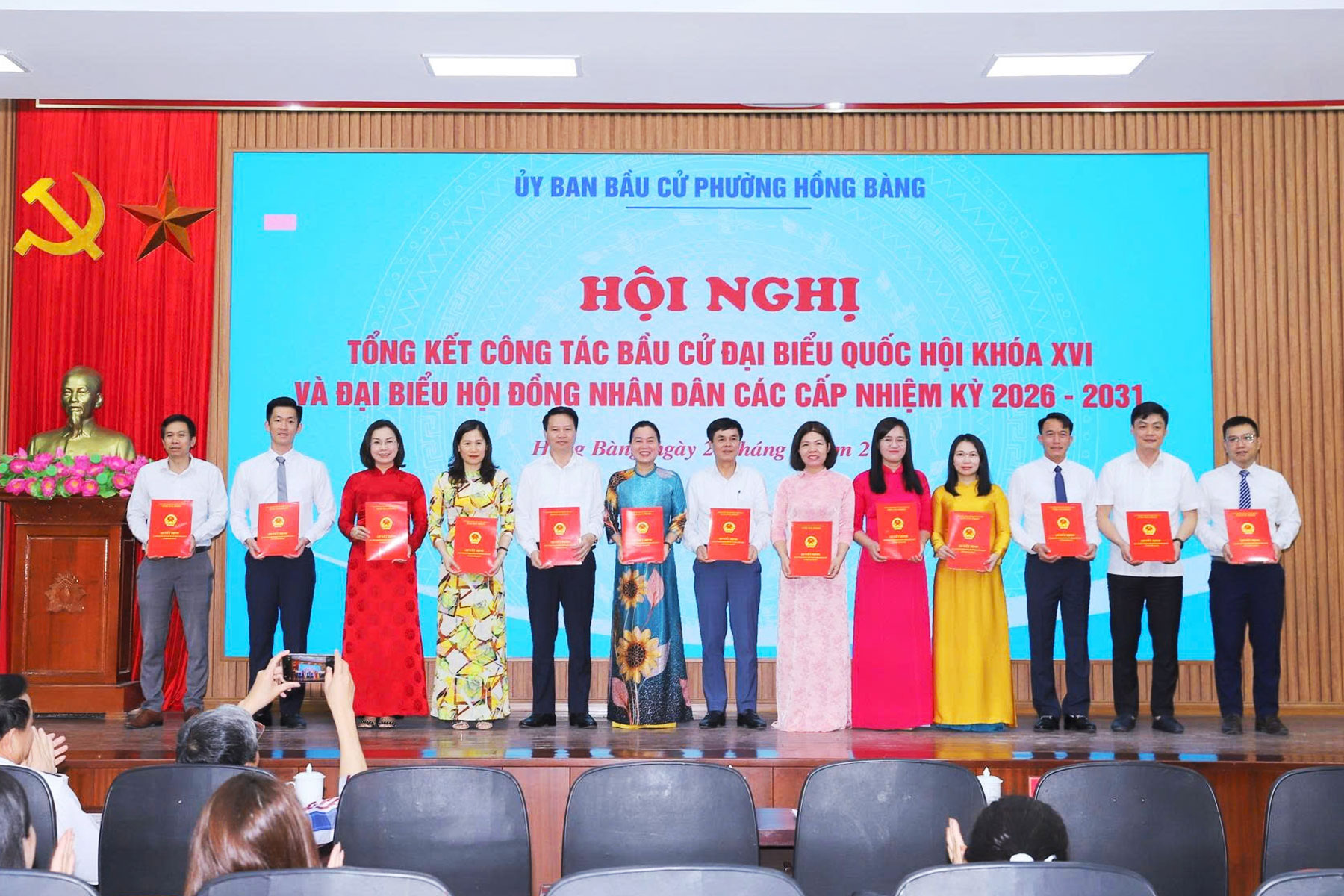 Trao Giấy chứng nhận đại biểu HĐND phường khóa II, nhiệm kỳ 2026 - 2031.Tại Hội nghị, Chủ tịch UBND phường Hồng Bàng đã Quyết định khen thưởng 37 tập thể, 29 cá nhân có thành tích xuất sắc trong công tác bầu cử đại biểu Quốc hội khóa XVI và đại biểu HĐND các cấp, nhiệm kỳ 2026 - 2031. Đồng thời công bố Nghị quyết xác nhận tư cách đại biểu HĐND phường, nhiệm kỳ 2026 - 2031; trao Giấy chứng nhận đại biểu HĐND phường khóa II, nhiệm kỳ 2026 - 2031./.