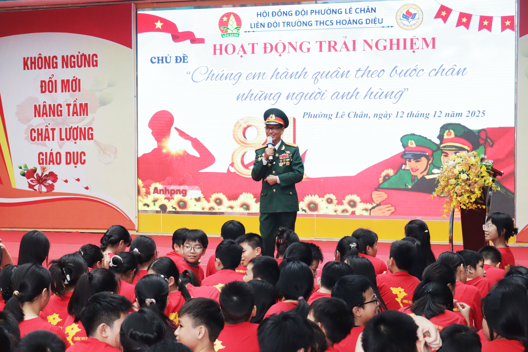 (Haiphong.gov.vn) - Chiều 12/12, Trường THCS Hoàng Diệu (phường Lê Chân) tổ chức chương trình trải nghiệm với chủ đề “Chúng em hành quân theo bước chân những người anh hùng” dành cho học sinh khối 6, 7, 8, thiết thực chào mừng Kỷ niệm 81 năm Ngày thành lập Quân đội nhân dân Việt Nam và Ngày Quốc phòng toàn dân (22/12/1944 - 22/12/2025).