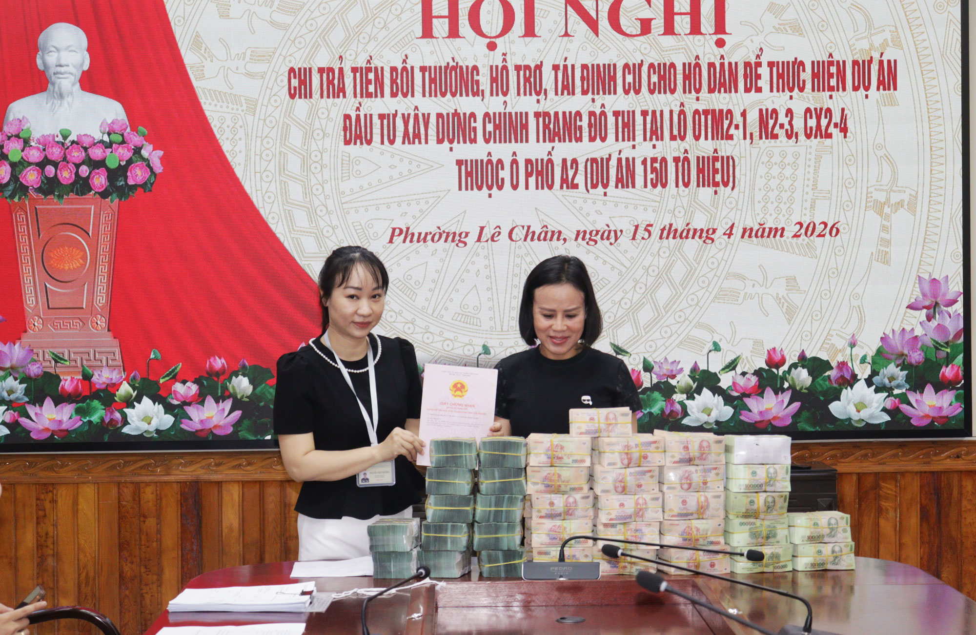 (Haiphong.gov.vn) - Sáng 15/4, UBND phường Lê Chân tổ chức chi trả tiền bồi thường, hỗ trợ, tái định cư cho hộ dân cuối cùng để thực hiện Dự án đầu tư xây dựng chỉnh trang đô thị tại các lô OTM2-1, N2-3, CX2-4 thuộc ô phố A2 (Dự án 150 Tô Hiệu).