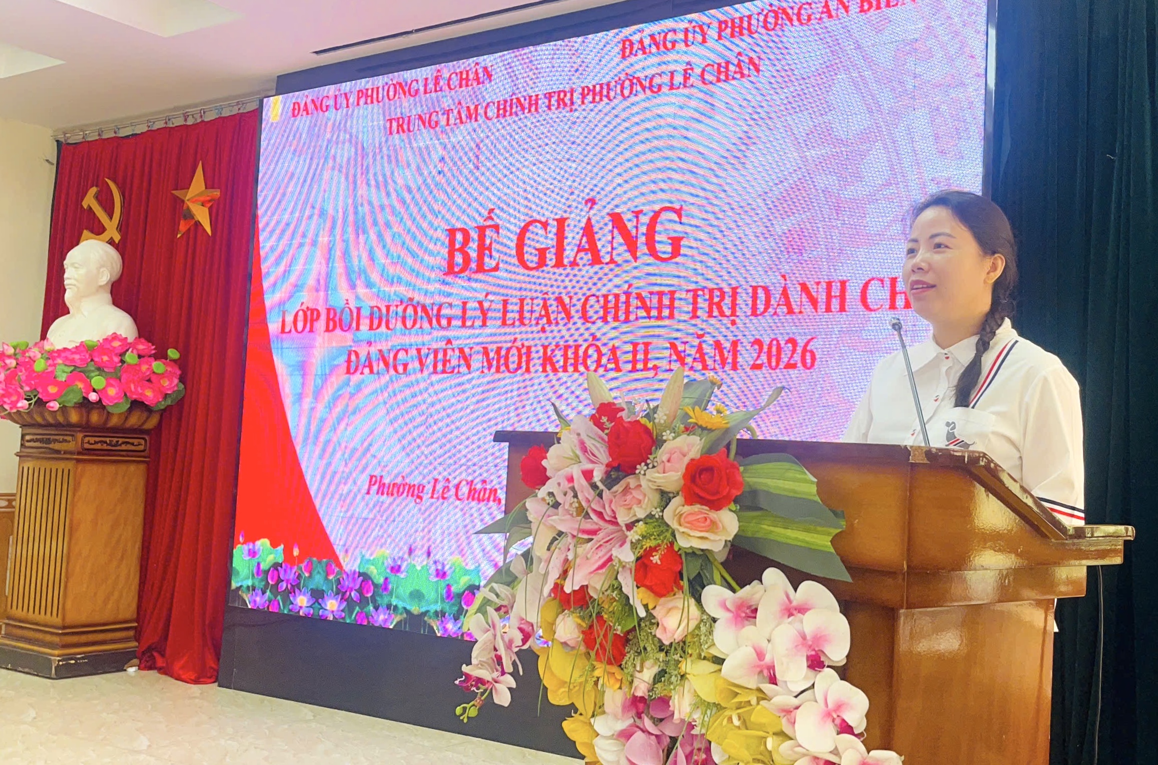 Đồng chí Lê Thị Thanh Tâm, Giám đốc Trung tâm Chính trị phường phát biểu tại Lễ bế giảng.Lớp bồi dưỡng đảng viên mới khóa II năm 2026 được tổ chức trong thời gian từ ngày 18/3 - 26/3/2026. Tham gia Lớp bồi dưỡng có 66 đảng viên trực thuộc các chi, đảng bộ cơ sở thuộc Đảng bộ phường Lê Chân và phường An Biên.