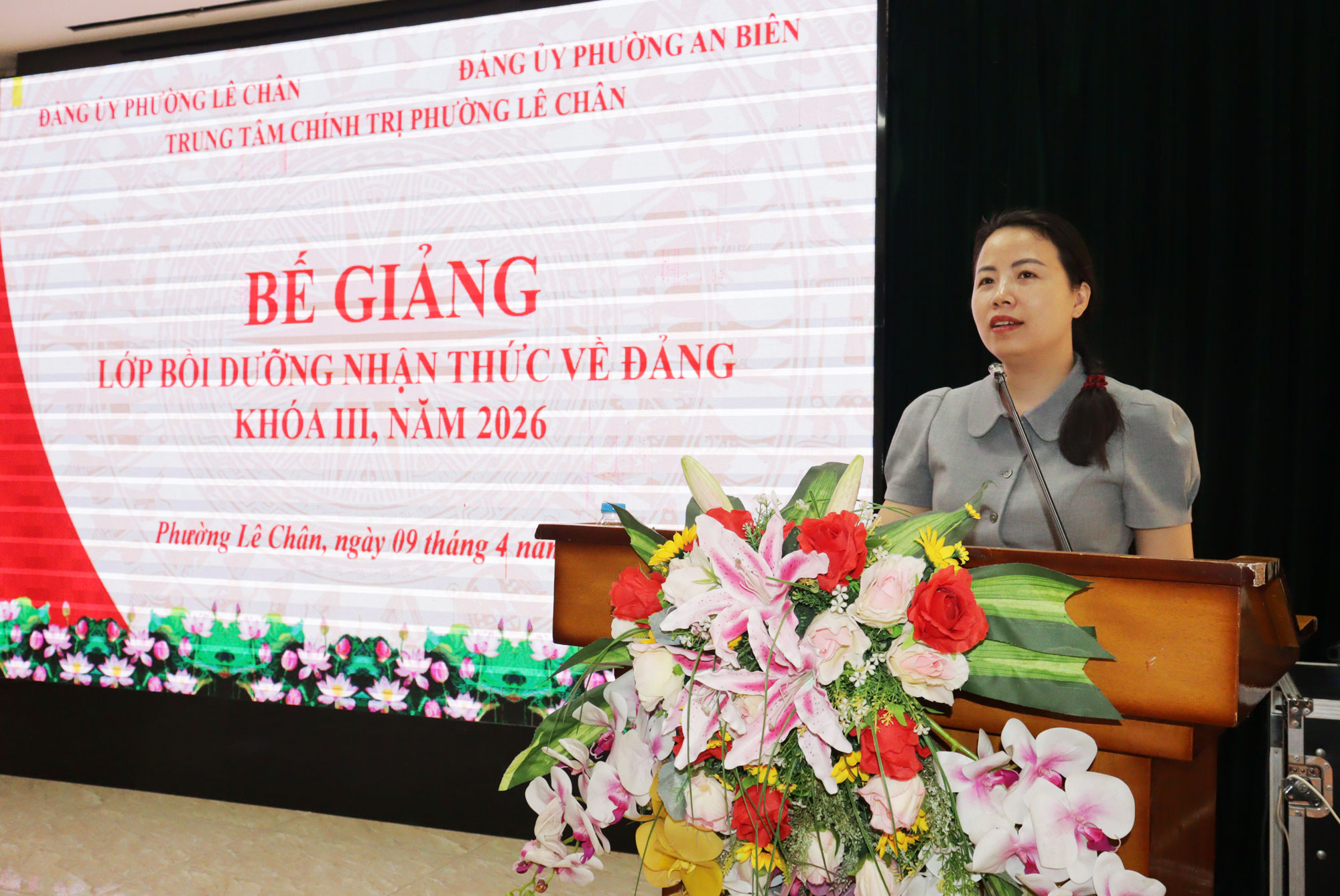 Đồng chí Lê Thị Thanh Tâm, Giám đốc Trung tâm Chính trị phường Lê Chân phát biểu tại Lễ bế giảng.Tham gia Lớp bồi dưỡng có 90 quần chúng ưu tú trực thuộc các chi, đảng bộ cơ sở thuộc Đảng bộ phường Lê Chân và phường An Biên. Trong thời gian học tập, học viên được nghiên cứu các chuyên đề về: Khái quát lịch sử Đảng cộng sản Việt Nam; Cương lĩnh xây dựng đất nước trong thời kỳ quá độ lên chủ nghĩa xã hội; Điều lệ Đảng cộng sản Việt Nam; học tập và làm theo tư tưởng, đạo đức, phong cách Hồ Chí Minh; phấn đấu để trở thành đảng viên Đảng cộng sản Việt Nam.