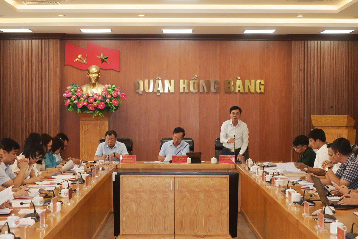Chỉ huy Trưởng Ban Chị huy quận sự quận phát biểu tại Hội nghị.Chủ động, quyết liệt trong công tác phòng chống và khắc phục Bão số 3 (Yagi). Các nhiệm vụ thực hiện Đề án điều chỉnh địa giới đơn vị hành chính huyện An Dương để mở rộng quận Hồng Bàng và sắp xếp, thành lập các phường thuộc quận Hồng Bàng đảm bảo đúng tiến độ. Các hoạt động văn hóa - xã hội có nhiều chuyển biến tích cực, an sinh xã hội được đảm bảo, đời sống vật chất và tinh thần của Nhân dân được nâng lên, trên địa bàn quận duy trì không còn hộ nghèo. Công tác cải cách hành chính gắn với chuyển đổi số, an toàn an ninh mạng được tập trung triển khai có hiệu quả. Tình hình an ninh chính trị, trật tự an toàn xã hội tiếp tục được giữ vững, triển khai mới nhiều mô hình liên kết đảm bảo an ninh trật tự và mô hình đảm bảo an toàn, phòng cháy chữa cháy, tạo được sự tin tưởng và đồng thuận cao trong Nhân dân.