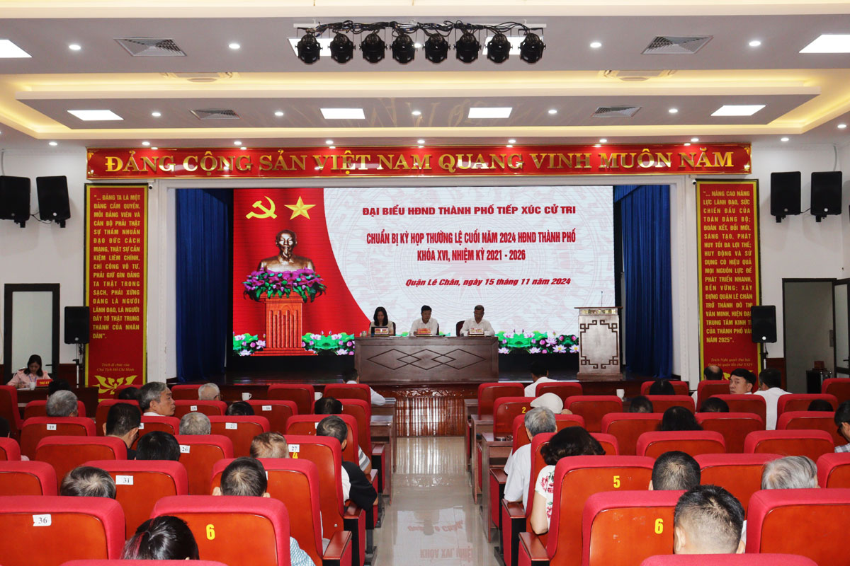 Quang cảnh cuộc tiếp xúc.Tại cuộc tiếp xúc, cử tri quận Lê Chân được đại biểu HĐND thành phố báo cáo về nội dung, thời gian tiến hành kỳ họp thường lệ cuối năm 2024; nghe dự thảo Báo cáo của UBND thành phố về kết quả thực hiện nhiệm vụ kinh tế - xã hội, quốc phòng - an ninh năm 2024; nhiệm vụ, giải pháp phát triển kinh tế - xã hội, quốc phòng - an ninh thành phố năm 2025 và một số Đề án trình tại Kỳ họp thường lệ cuối năm 2024…