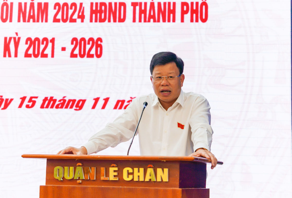 Cử tri phát biểu tại cuộc tiếp xúc.Cử tri đồng tình và đánh giá cao nội dung, chương trình kỳ họp, những kết quả phát triển kinh tế - xã hội của thành phố năm 2024. Cử tri quận Lê Chân phản ánh, sau cơn Bão số 3, hệ thống điện chiếu sáng của một số ngõ, phố hư hỏng không hoạt động; nhiều tuyến ngõ trên địa bàn quận xuống cấp trầm trọng nhiều năm nay nhưng chưa được tu bổ nâng cấp; còn tình trạng đỗ xe ô tô dưới lòng đường không đúng quy định gây ách tắc giao thông; Công viên Thể thao Hồ Sen sau một thời gian đi vào sử dụng hiện xuống cấp, cơ sở vật chất không bảo đảm... đề nghị thành phố quan tâm, có hướng giải quyết. Cử tri cũng đề nghị đẩy nhanh tiến độ thực hiện Dự án cải tạo Hồ Sen và các tuyến đường quanh hồ để nâng cao chất lượng cuộc sống người dân quanh khu vực này.