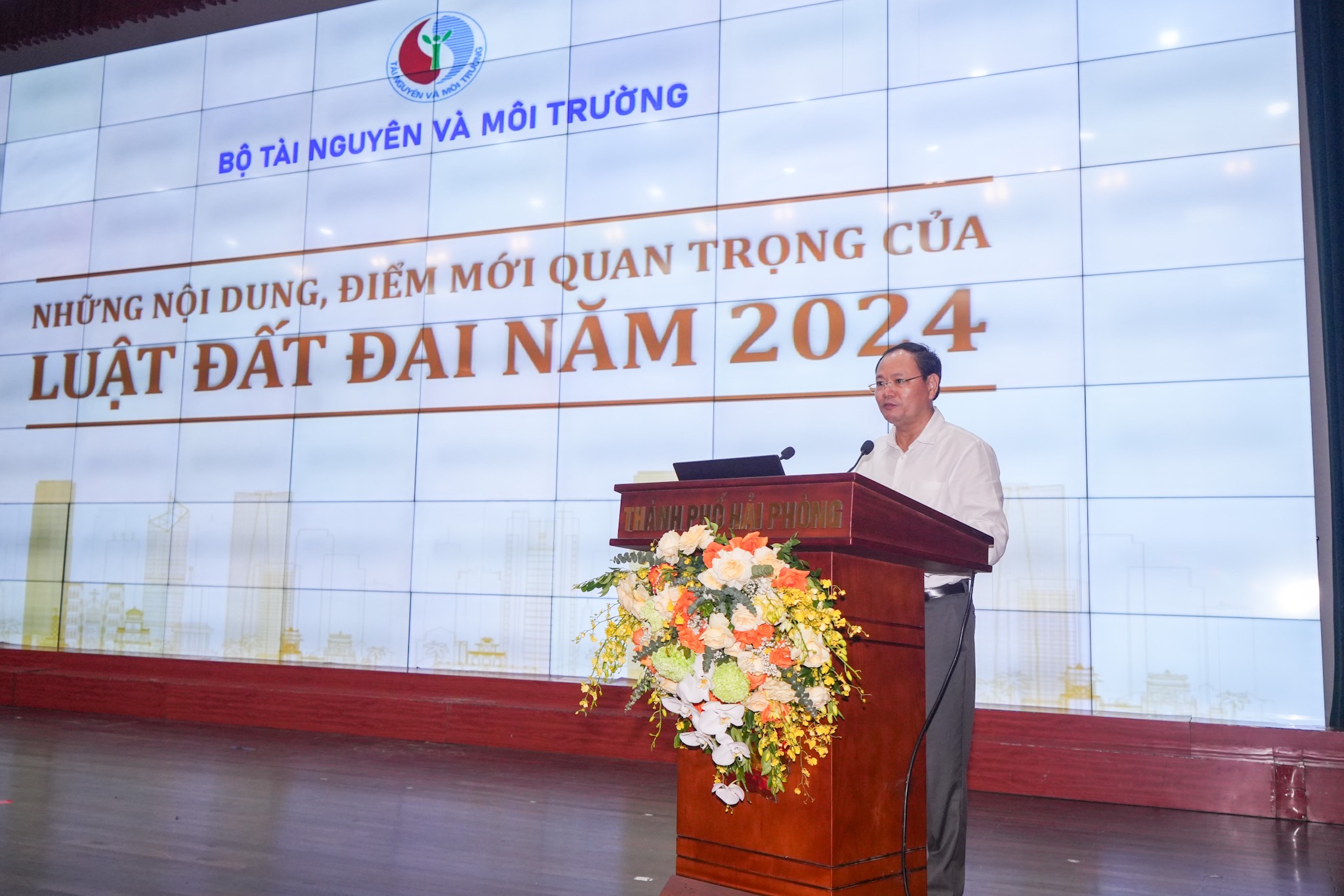Thứ trưởng Bộ Tài nguyên và Môi trường Lê Minh Ngân phát biểu tại Hội nghị.Giới thiệu các nội dung, điểm mới quan trọng của Luật Đất đai năm 2024, Thứ trưởng Bộ Tài nguyên và Môi trường đề nghị lãnh đạo UBND thành phố Hải Phòng chỉ đạo các cơ quan chuyên môn khẩn trương xây dựng các văn bản hướng dẫn theo thẩm quyền để khi Quốc hội đồng ý cho Luật có hiệu lực sớm (vào ngày 1/8 tới) sẽ tạo hành lang pháp lý, điều kiện để thành phố phát triển./.