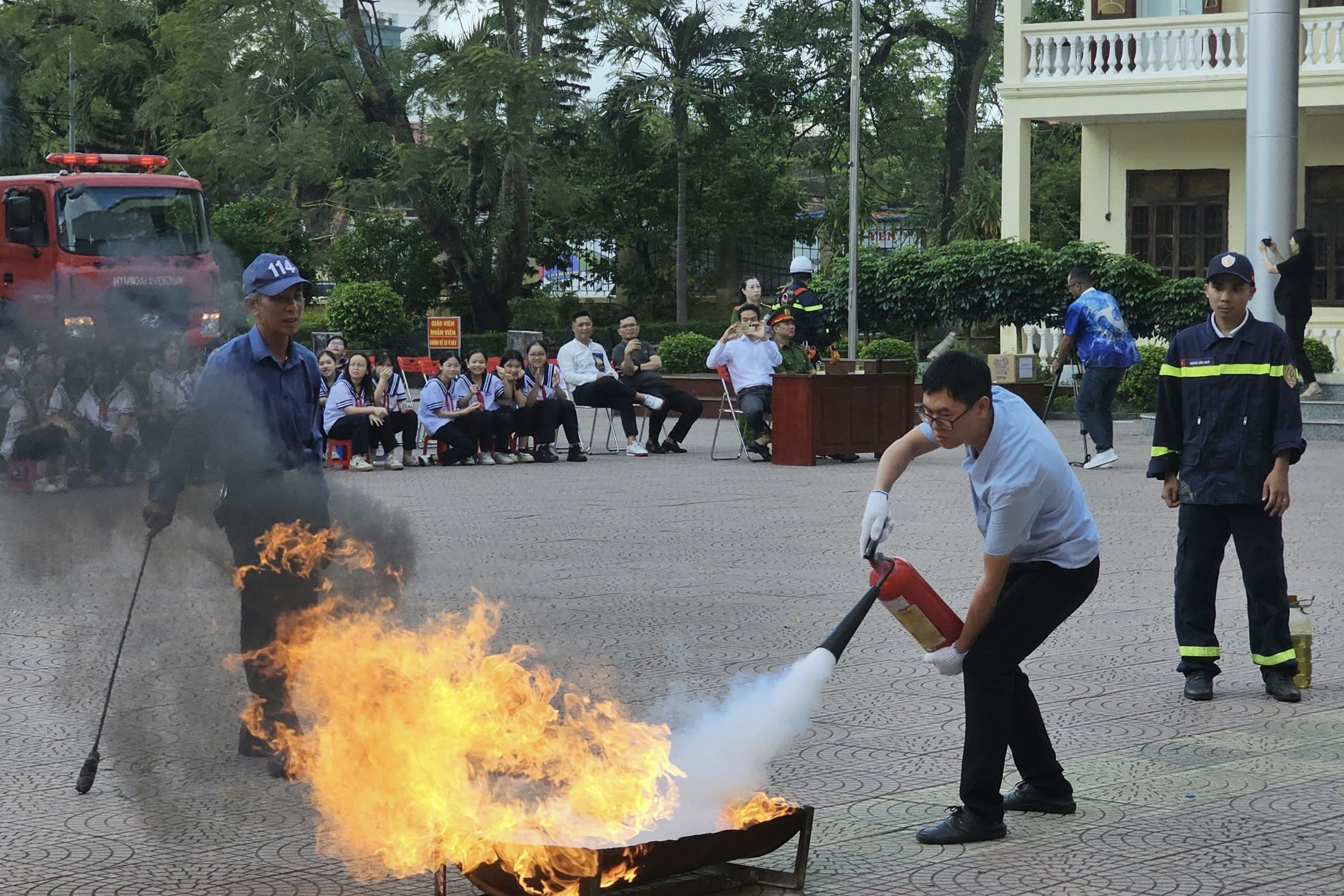 Thực tập phương án chữa cháy và CNCH.Khi phát hiện ra đám cháy, lực lượng PCCC cơ sở đã nhanh chóng sử dụng bình chữa cháy tiến hành phun vào đám cháy để ngăn ngừa sự phát triển của đám cháy nhưng do lượng chất cháy lớn, tốc độ cháy lan nhanh, đám cháy phát triển vượt quá mức kiểm soát. Lực lượng PCCC cơ sở đã gọi điện báo lực lượng Cảnh sát PCCC và CNCH theo số điện thoại 114.