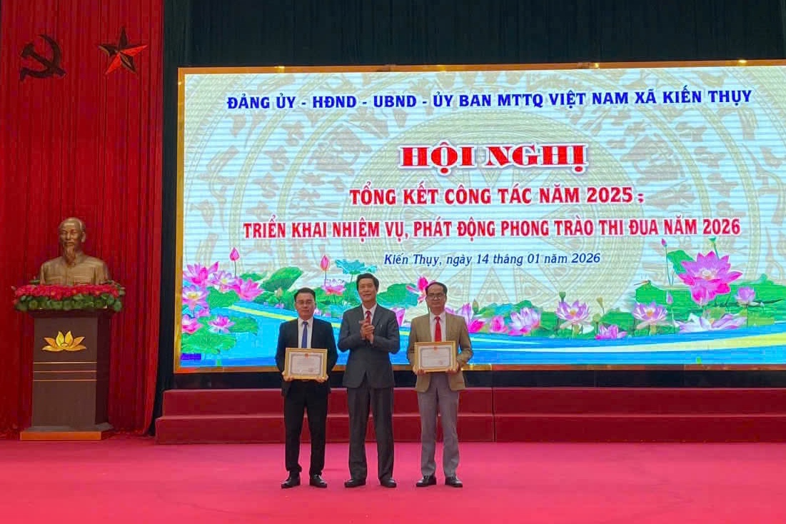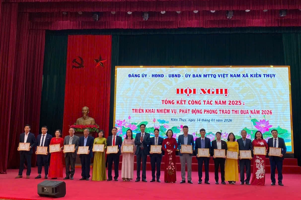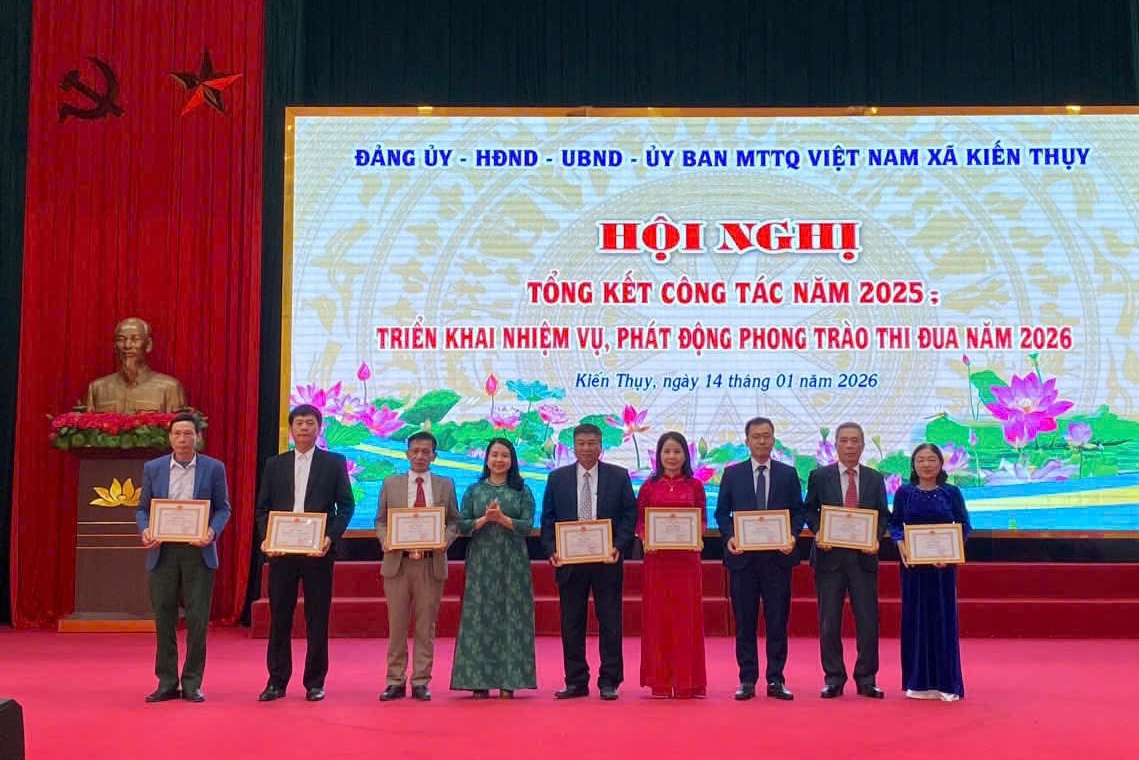 Các tập thể, cá nhân có thành tích xuất sắc được khen thưởng.Tại Hội nghị, xã Kiến Thụy công bố các Quyết định của UBND xã về giao chỉ tiêu kế hoạch phát triển kinh tế - xã hội, giao dự toán ngân sách nhà nước năm 2026; đồng thời, khen thưởng, biểu dương các tập thể, cá nhân có thành tích xuất sắc; phát động phong trào thi đua năm 2026.