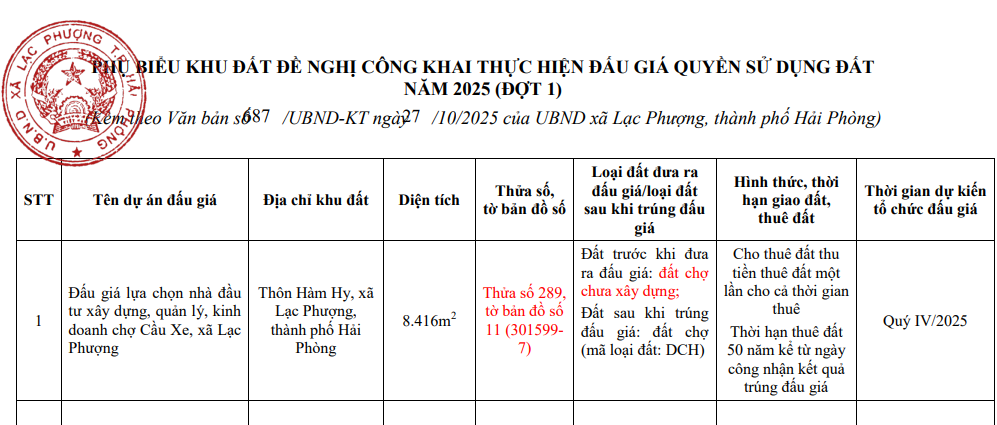 Để việc đấu giá quyền sử dụng đất đảm bảo đúng quy định, căn cứ khoản 5 Điều 125 Luật Đất đai (hướng dẫn tại Nghị định số 151/2025/NĐ-CP ngày 12/6/2025 của Chính phủ), UBND xã Lạc Phượng công khai thông tin khu đất thực hiện đấu giá quyền sử dụng đất năm 2025 (Đợt 1):