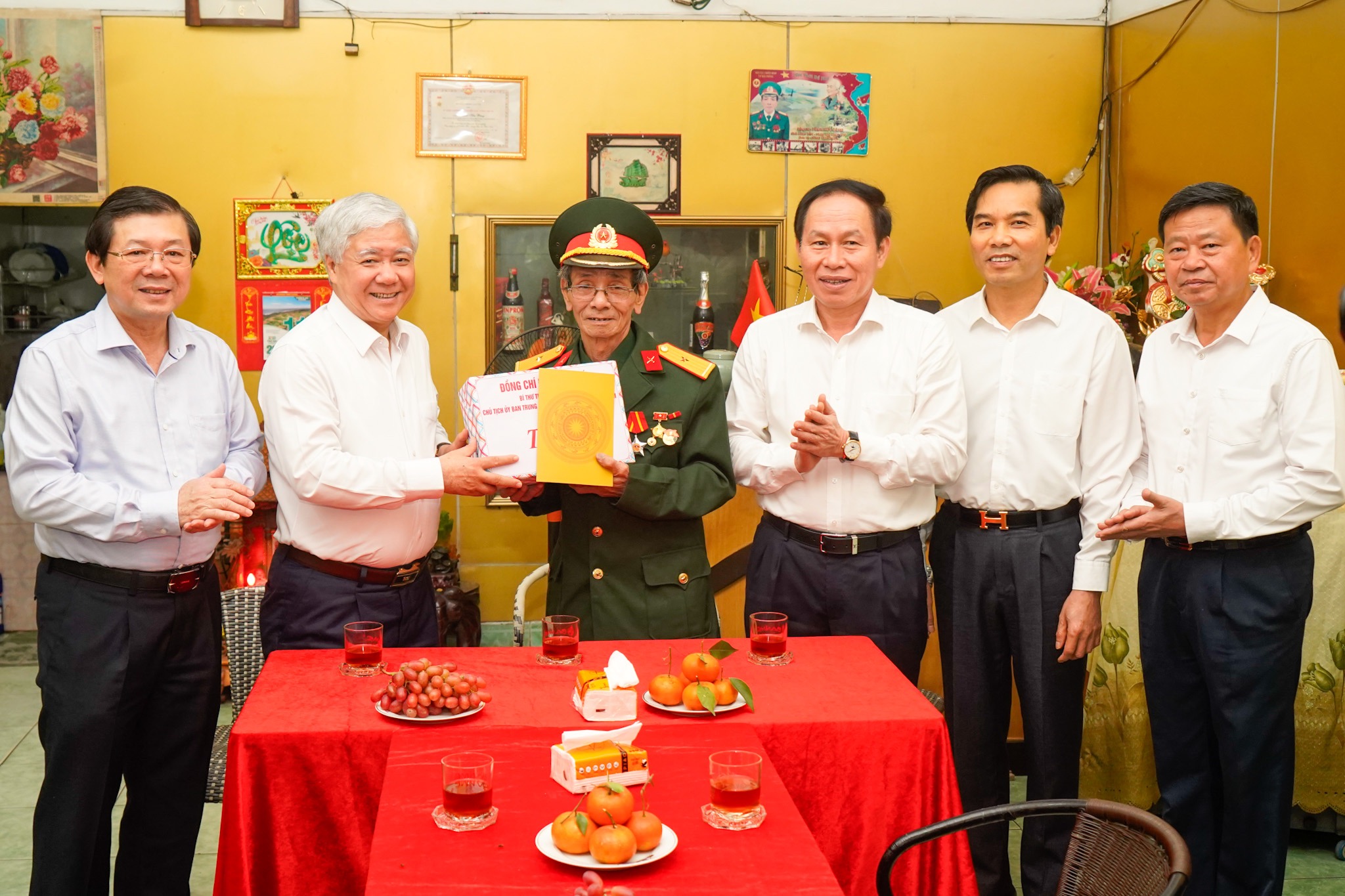 Chủ tịch Ủy ban Trung ương MTTQ Việt Nam Đỗ Văn Chiến và Bí thư Thành ủy Lê Tiến Châu thăm hỏi sức khỏe ông Phạm Hữu Bằng.