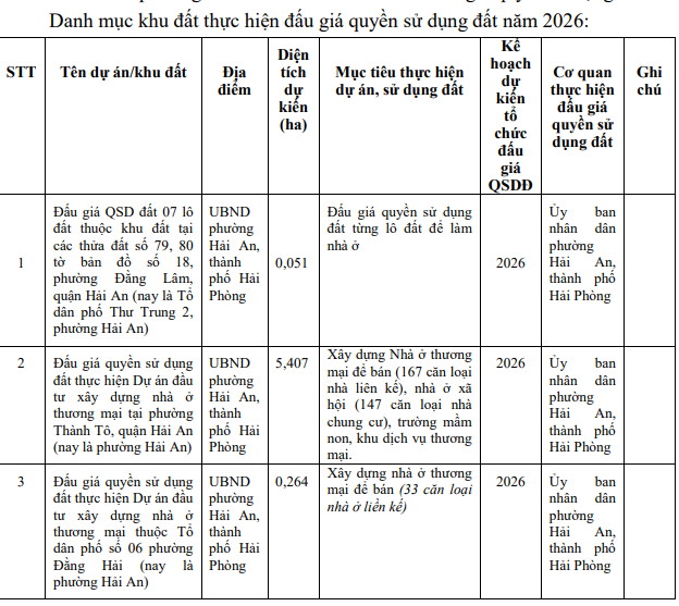 (Haiphong.gov.vn) - Thực hiện quy định tại điểm a khoản 5 Điều 125 Luật Đất đai năm 2024 về việc “hàng năm phải công bố kế hoạch, danh mục các khu đất thực hiện đấu giá quyền sử dụng đất trên Cổng Thông tin đấu giá quyền sử dụng đất quốc gia, Cổng Thông tin điện tử của Ủy ban nhân dân cấp tỉnh”. UBND phường Hải An công khai kế hoạch, danh mục khu đất thực hiện đấu giá quyền sử dụng đất trên địa bàn phường Hải An năm 2026 trên Cổng Thông tin điện tử thành phố, cụ thể như sau:
