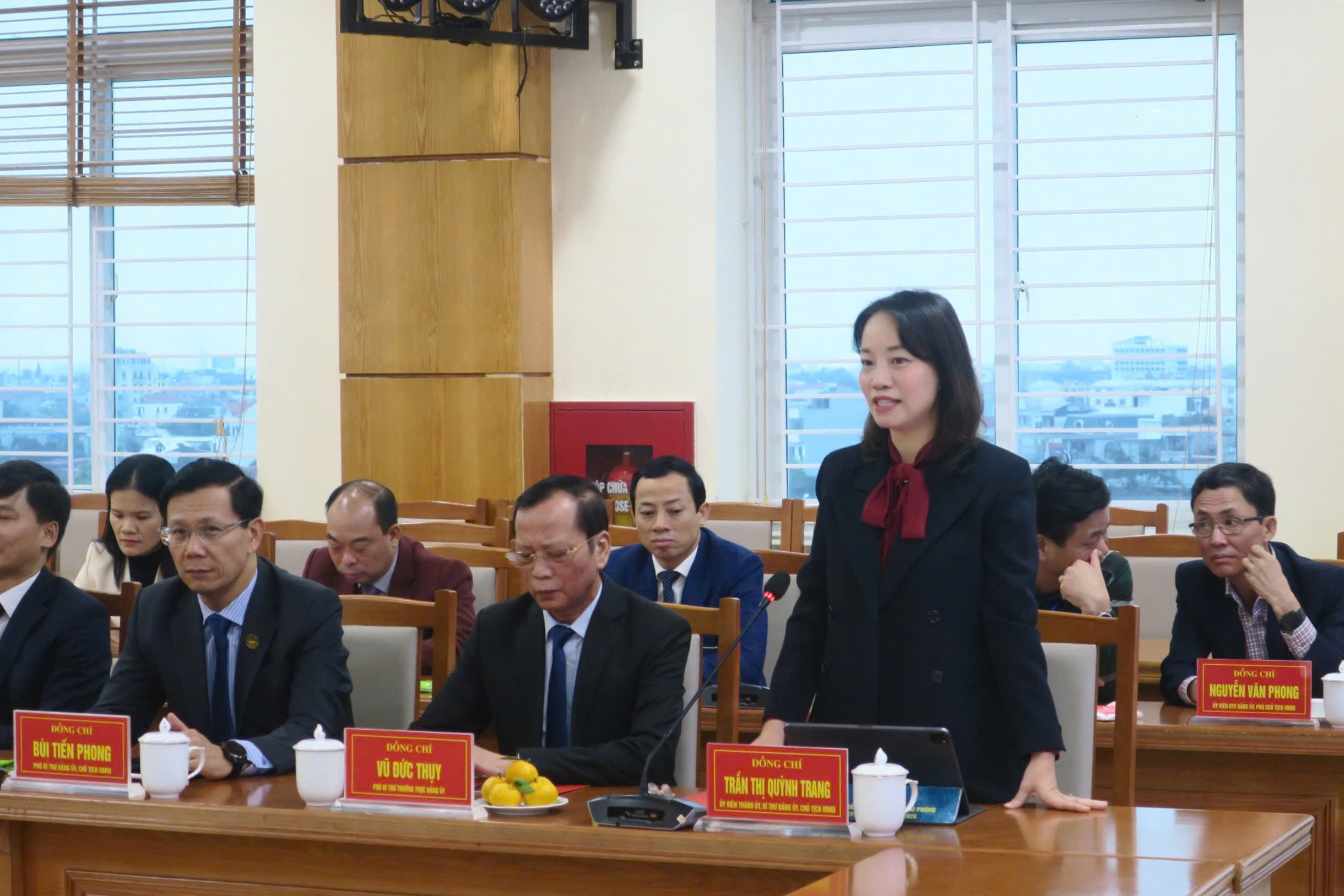 Đồng chí Trần Thị Quỳnh Trang, Bí thư Đảng ủy, Chủ tịch HĐND phường An Dương phát biểu.Thông qua chương trình kết nghĩa, các địa phương phát huy tối đa tiềm năng, lợi thế, bản sắc và nguồn lực đặc thù, hỗ trợ lẫn nhau trong phát triển toàn diện, nâng cao năng lực lãnh đạo, sức chiến đấu của tổ chức Đảng, hiệu lực, hiệu quả quản trị của chính quyền và chất lượng cuộc sống của nhân dân.