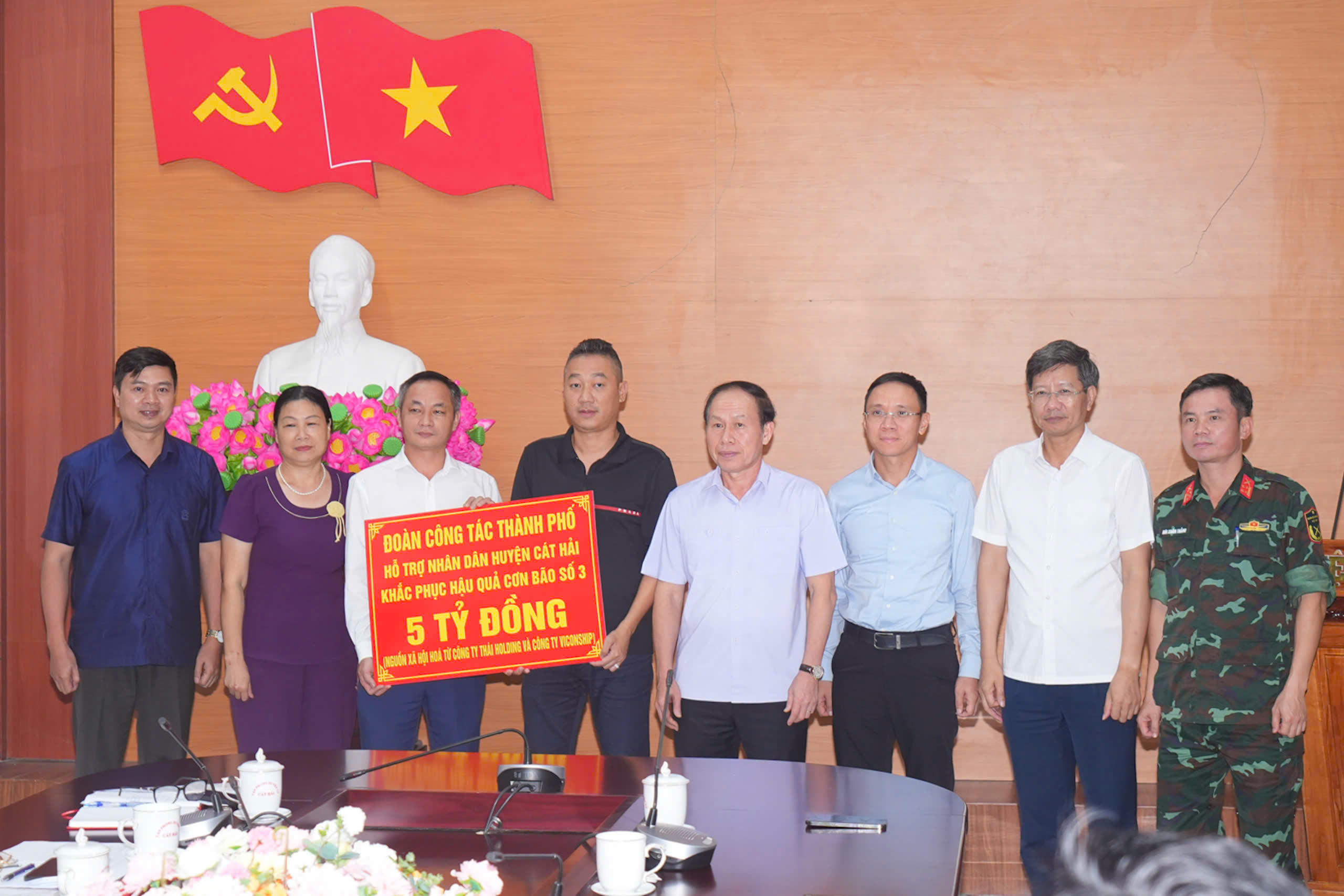 Nhân dịp này, Đoàn công tác lãnh đạo thành phố đã hỗ trợ Nhân dân huyện Cát Hải 5 tỷ đồng khắc phục hậu quả cơn bão số 3 từ nguồn xã hội hóa các doanh nghiệp.
