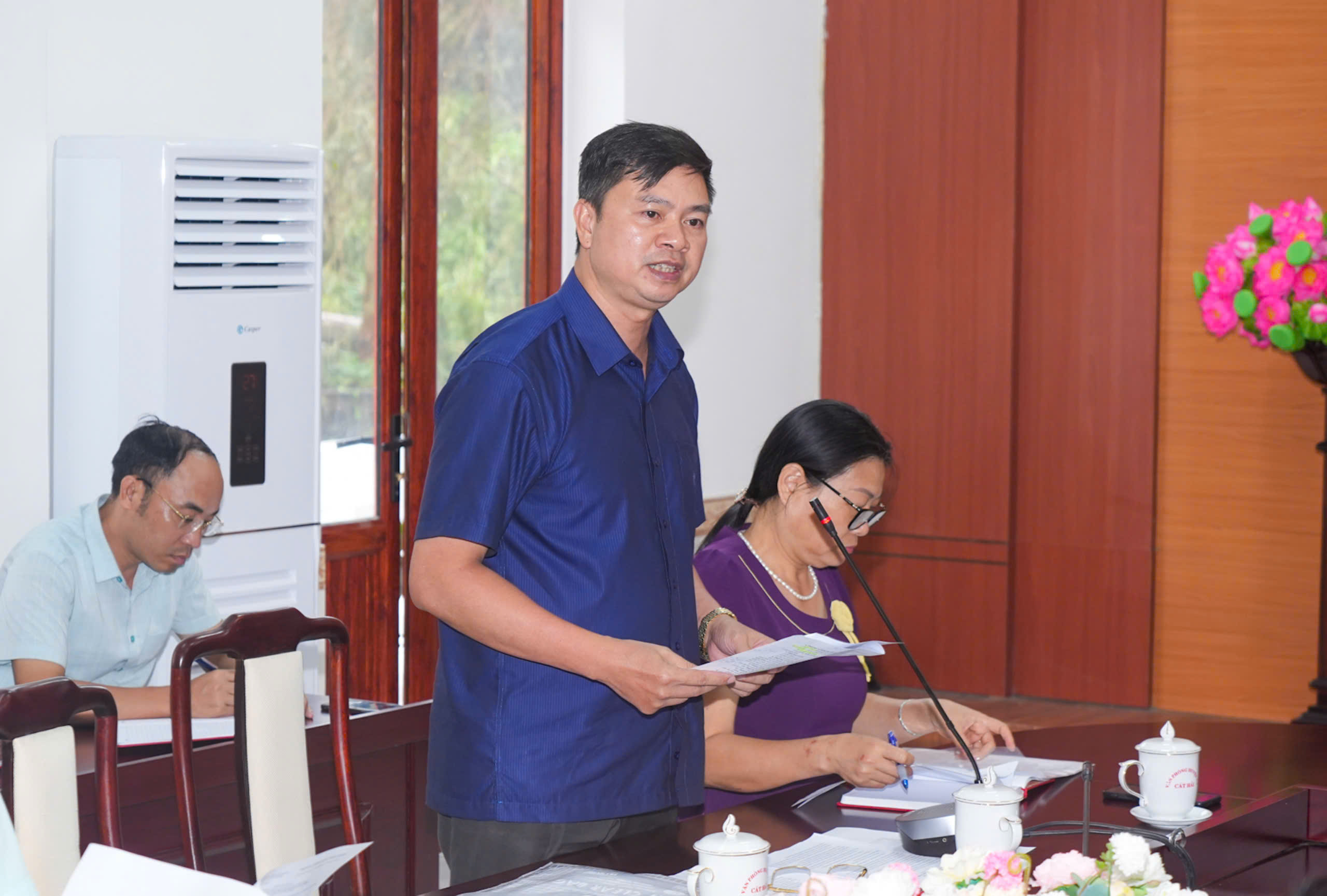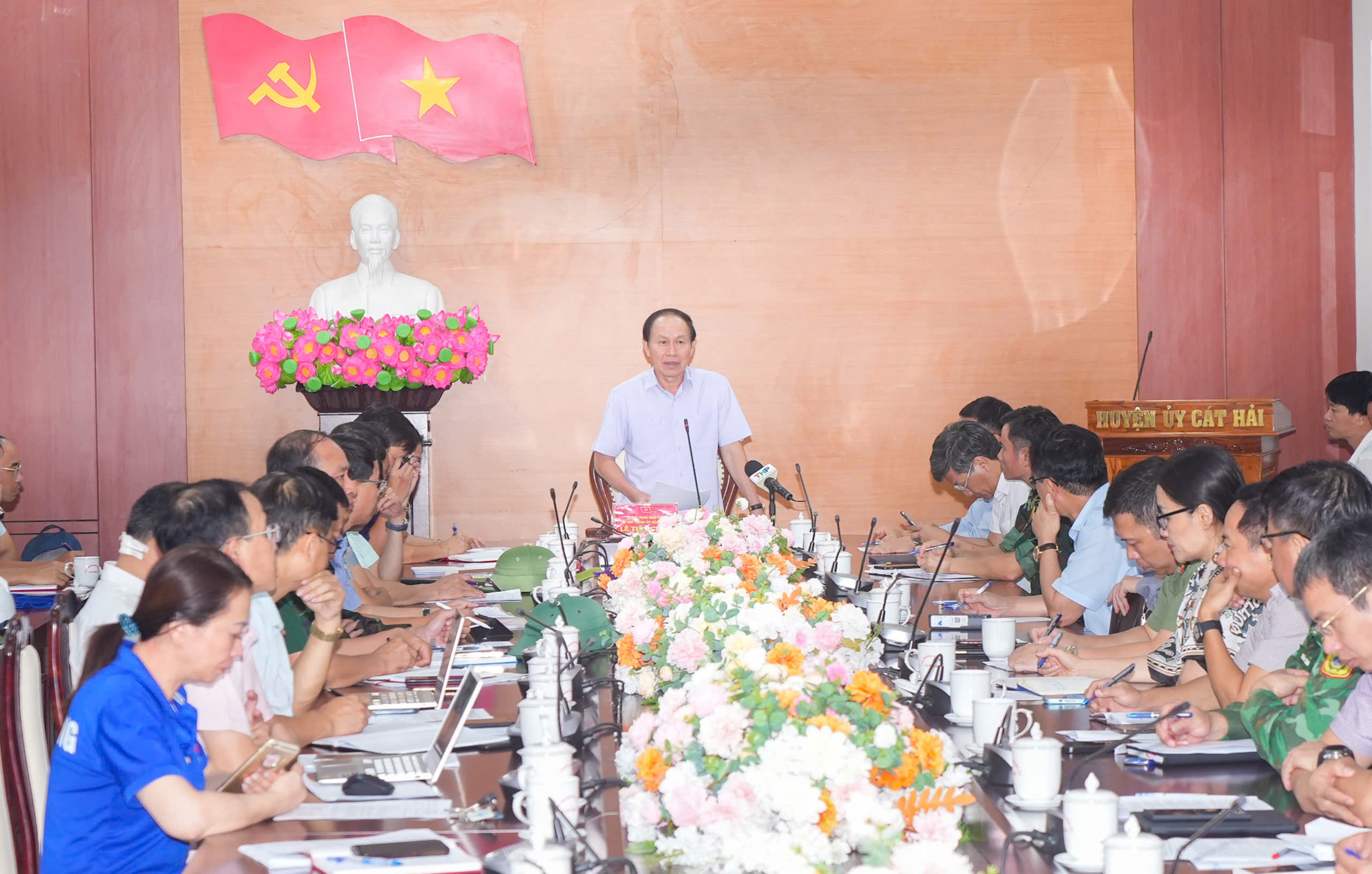 Chủ tịch UBND huyện Cát Hải báo cáo tại cuộc làm việc.Tại cuộc làm việc, huyện Cát Hải đề nghị Thành ủy, HĐND, UBND thành phố quan tâm chỉ đạo các cơ quan chức năng hỗ trợ địa phương sớm khắc phục hệ thống lưới điện bị hư hỏng do bão gây ra trên địa bàn huyện; hỗ trợ địa phương sớm khôi phục hệ thống thông tin liên lạc trên địa bàn huyện; trang bị cho huyện 01 xe phát sóng lưu động để đáp ứng yêu cầu thông tin liên lạc phòng chống thiên tai khi hệ thống thông tin liên lạc trên địa bàn huyện bị tê liệt hoàn toàn; hỗ trợ kinh phí khắc phục hậu quả sau bão; cho huyện Cát Hải lùi thời gian tổ chức diễn tập khu vực phòng thủ huyện để hoàn thiện công tác chuẩn bị theo đúng chỉ đạo của thành phố do hiện nay cơ sở vật chất chuẩn bị cho diễn tập bị hư hỏng hoàn toàn do bão gây ra.