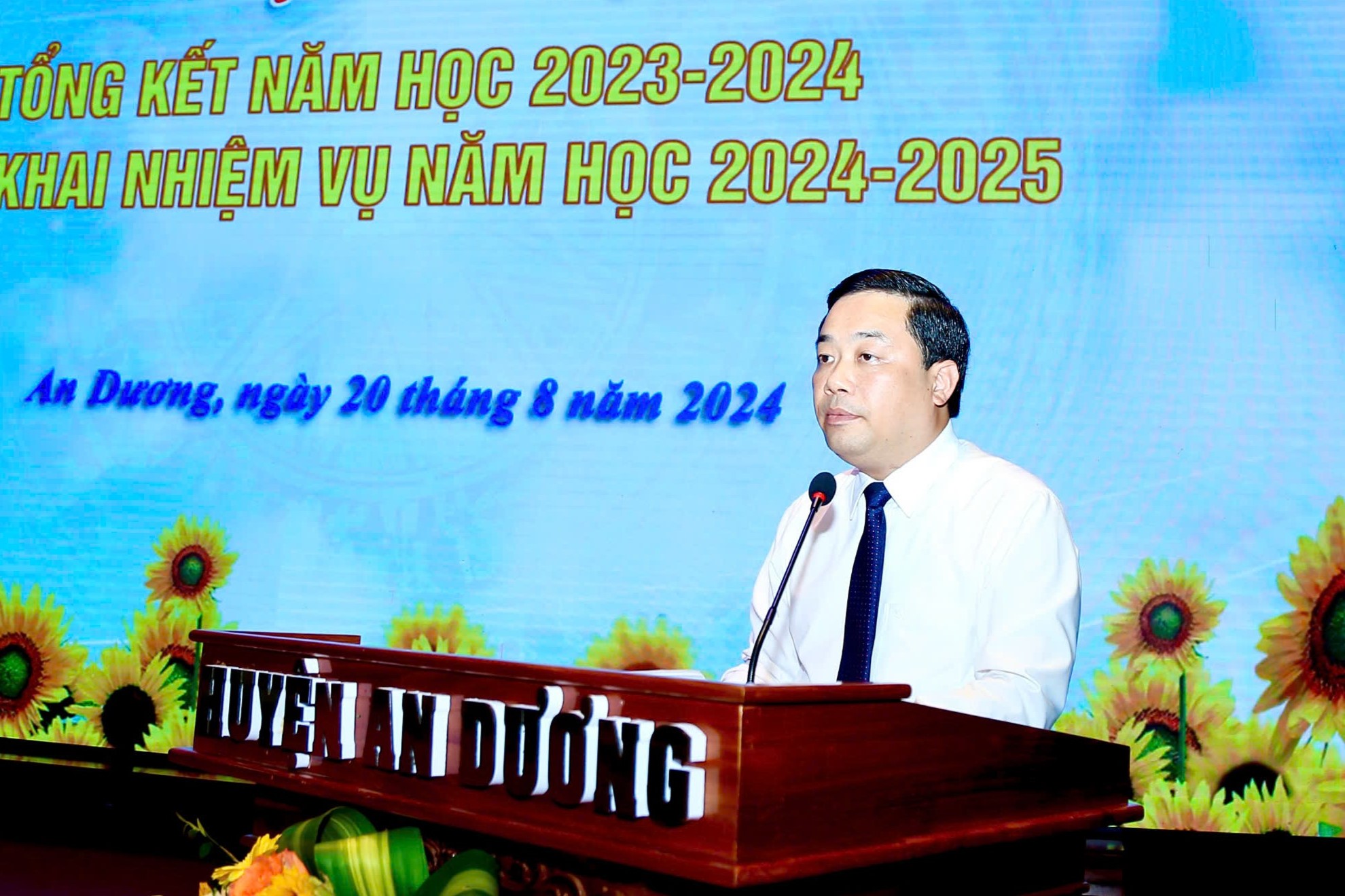 Đồng chí Vũ Mạnh Hùng, Trưởng phòng Giáo dục và Đào tạo huyện thông tin kết quả đạt được trong năm học 2023 - 2024.Đến nay, huyện An Dương là đơn vị đầu tiên của thành phố có 100% trường công lập đạt chuẩn quốc gia (50/50 trường), trong đó 03 trường đạt chuẩn quốc gia mức độ 2. Phấn đấu đến năm 2025, xây dựng thêm 15 trường đạt chuẩn quốc gia mức độ 2. Nhiều nhiệm vụ lớn được hoàn thành như xây dựng đề án phát triển giáo dục mầm non và phổ thông huyện An Dương đến năm 2030 với mục tiêu phấn đấu xây dựng huyện An Dương trở thành “trọng điểm phát triển giáo dục của thành phố”. Công tác chuyển đổi số, ứng dụng số hóa trong triển khai cơ sở dữ liệu ngành được đẩy mạnh; lĩnh vực giáo dục được UBND huyện chọn là 01 trong 5 lĩnh vực đi đầu trong chuyển đổi số của huyện. Mạng lưới quy mô trường lớp ngày càng ổn định và phát triển với 62 trường, 53.348 học sinh/1.427 lớp; so với năm học 2022-2023 tăng 01 trường, tăng 2.510 học sinh/53 lớp. Huyện An Dương xếp thứ 03/14 quận, huyện về quy mô số trường, số lớp và số học sinh trong thành phố.