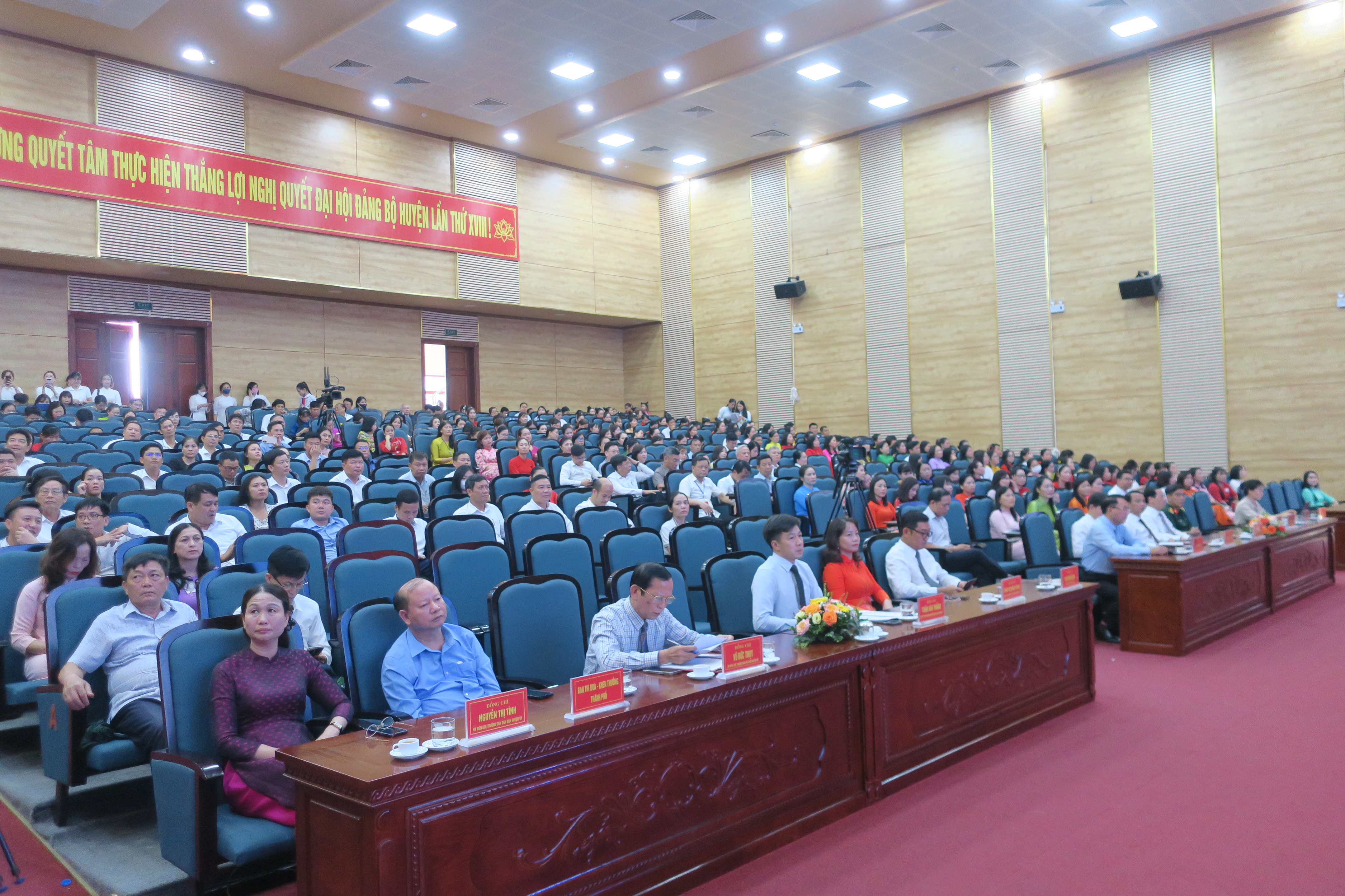 Đại diện các tập thể được khen thưởng tại Hội nghị.Năm học 2024 - 2025, ngành Giáo dục và Đào tạo huyện tiếp tục phấn đấu thực hiện thắng lợi chủ đề “Kỷ cương trách nhiệm, đổi mới sáng tạo, nâng cao chất lượng giáo dục và đào tạo”; xây dựng trường học 05 tốt “Môi trường giáo dục tốt - quản lý tốt - dạy tốt - học tốt - phục vụ tốt” với 03 khâu đột phá: (1) đi đầu trong thực hiện chuyển đổi số, cải cách hành chính trong toàn ngành; (2) đổi mới phương pháp, hình thức, hoạt động giáo dục đảm bảo nâng cao chất lượng giáo dục toàn diện, giáo dục mũi nhọn, chất lượng thi vào 10 THPT; (3) tăng cường các nguồn lực đầu tư cơ sở vật chất trường, lớp học theo hướng chuẩn hóa, hiện đại hóa.