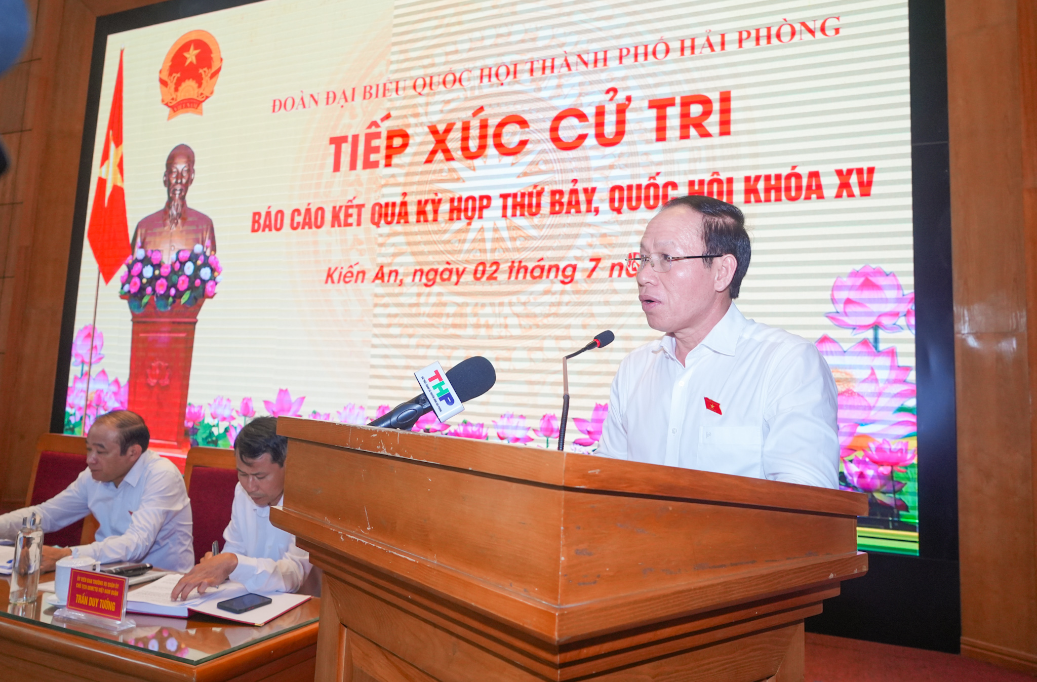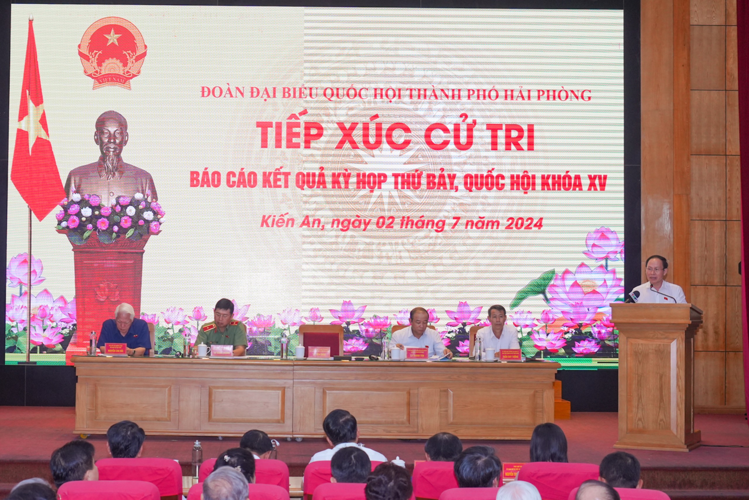 Đoàn đại biểu Quốc hội thành phố Hải Phòng điều hành cuộc tiếp xúc cử tri quận Kiến AnBáo cáo tới cử tri quận Kiến An về kết quả Kỳ họp thứ 7, Quốc hội khóa XV, đồng chí Lã Thanh Tân, Phó Trưởng Đoàn đại biểu Quốc hội chuyên trách thành phố Hải Phòng cho biết: sau 27,5 ngày làm việc (Đợt 1: từ ngày 20/5 đến ngày 08/6/2024; Đợt 2: từ ngày 17/6 đến sáng ngày 29/6/2024) với tinh thần đoàn kết, dân chủ, chủ động, khẩn trương và trách nhiệm cao, Kỳ họp thứ Bảy, Quốc hội khóa XV đã hoàn thành toàn bộ chương trình đề ra với kết quả: xem xét, quyết định công tác nhân sự thuộc thẩm quyền, các vấn đề về kinh tế - xã hội, ngân sách nhà nước; thông qua 11 Luật, 21 Nghị quyết, cho ý kiến lần đầu đối với 11 Dự án luật khác; đồng thời tiến hành chất vấn và trả lời chất vấn; giám sát tối cao chuyên đề “Việc thực hiện Nghị quyết số 43/2022/QH15 ngày 11/01/2022 của Quốc hội về chính sách tài khóa, tiền tệ hỗ trợ Chương trình phục hồi, phát triển kinh tế - xã hội và các Nghị quyết của Quốc hội về một số Dự án quan trọng quốc gia đến hết năm 2023”; xem xét báo cáo về tổng hợp kiến nghị của cử tri và Nhân dân, báo cáo kết quả giám sát việc giải quyết kiến nghị của cử tri, cùng một số nội dung quan trọng khác.