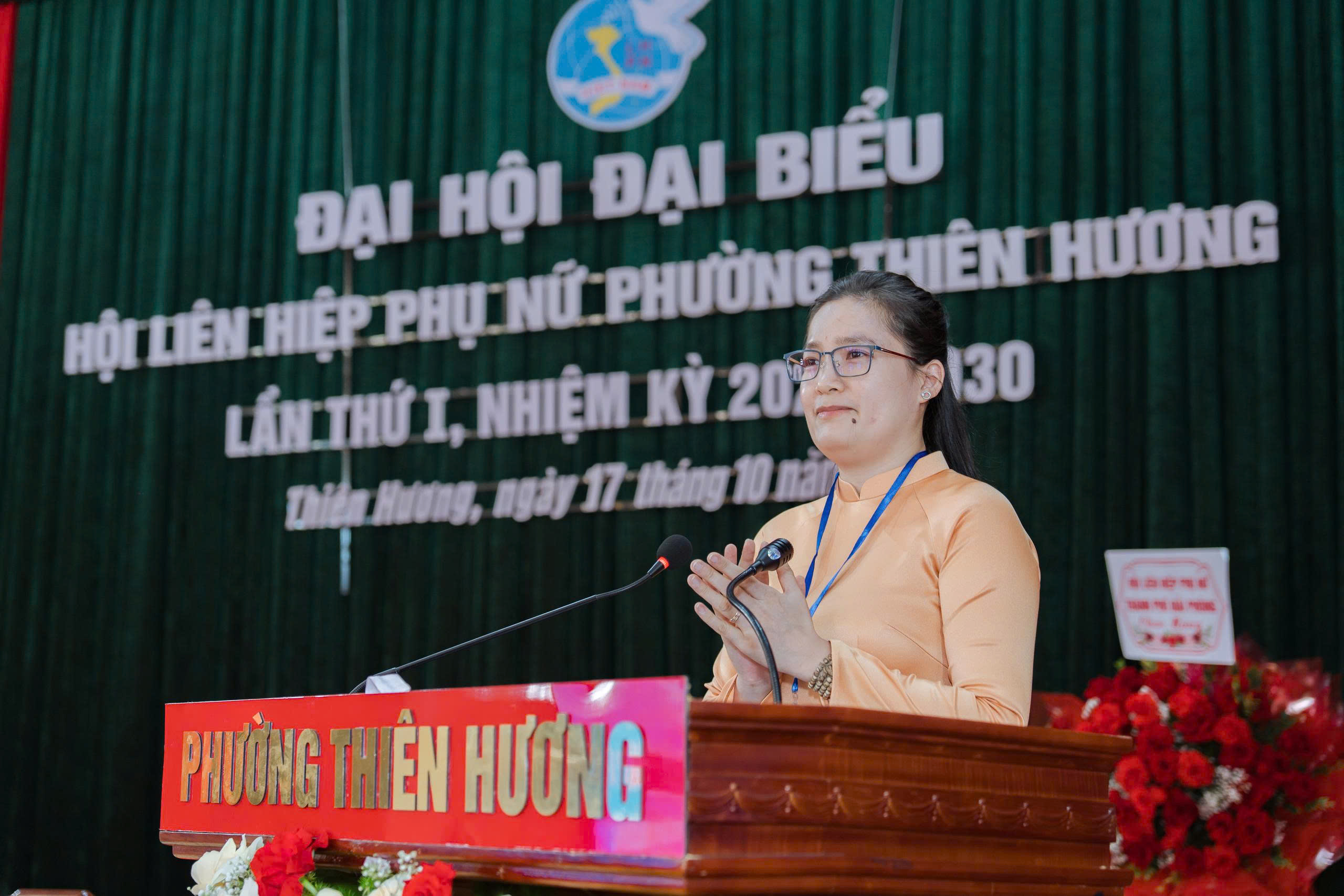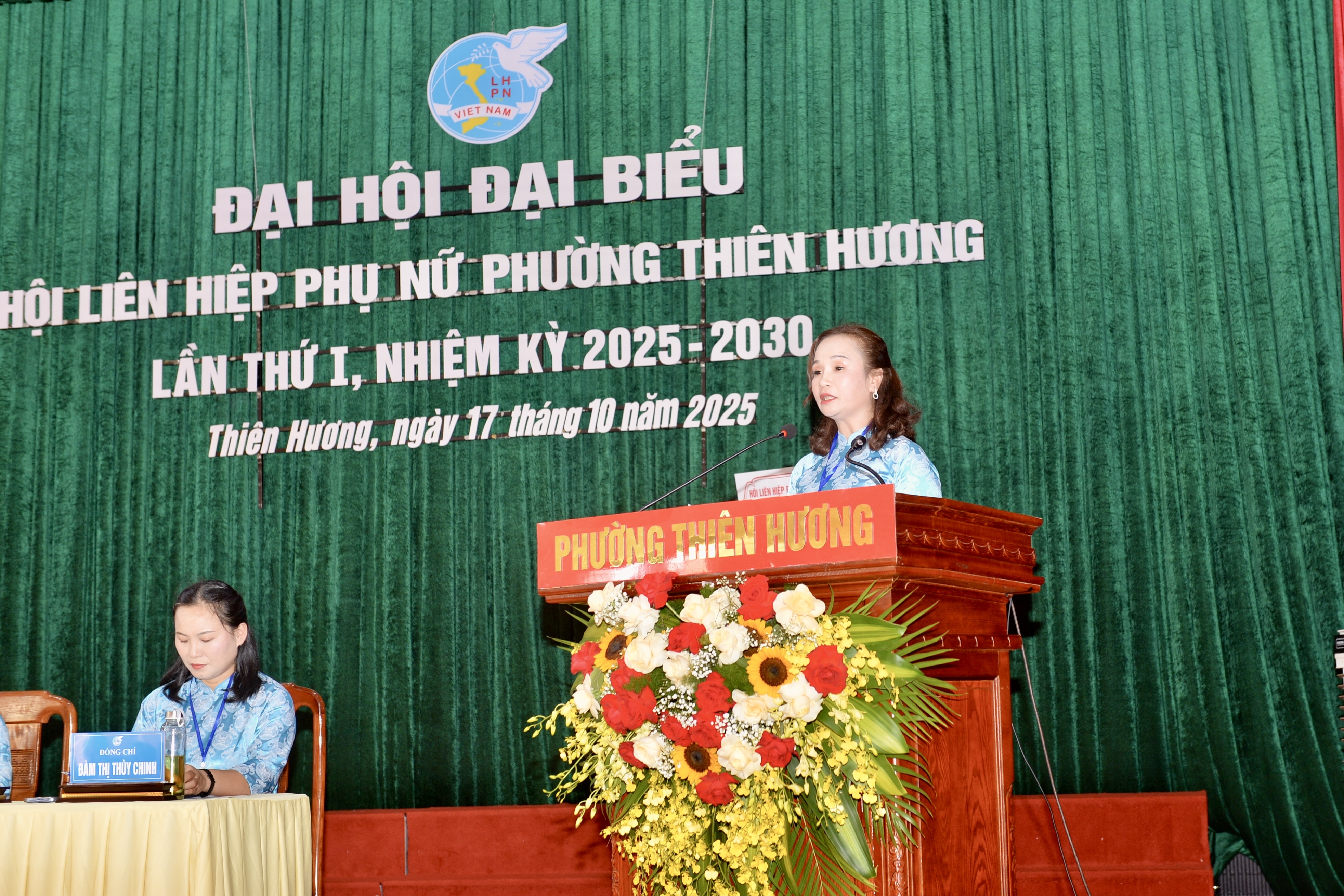 Chủ tịch Hội LHPN phường Thiên Hương Vũ Thị Mai Thùy báo cáo tại Đại hội.Nhiệm kỳ 2021–2025, Hội LHPN phường đã phát huy sức mạnh tập thể, tích cực hưởng ứng các phong trào thi đua yêu nước, các cuộc vận động lớn như “Phụ nữ tích cực học tập, lao động sáng tạo, xây dựng gia đình hạnh phúc”, “Xây dựng người phụ nữ Việt Nam thời đại mới”, gắn với việc thực hiện các nhiệm vụ chính trị của địa phương.