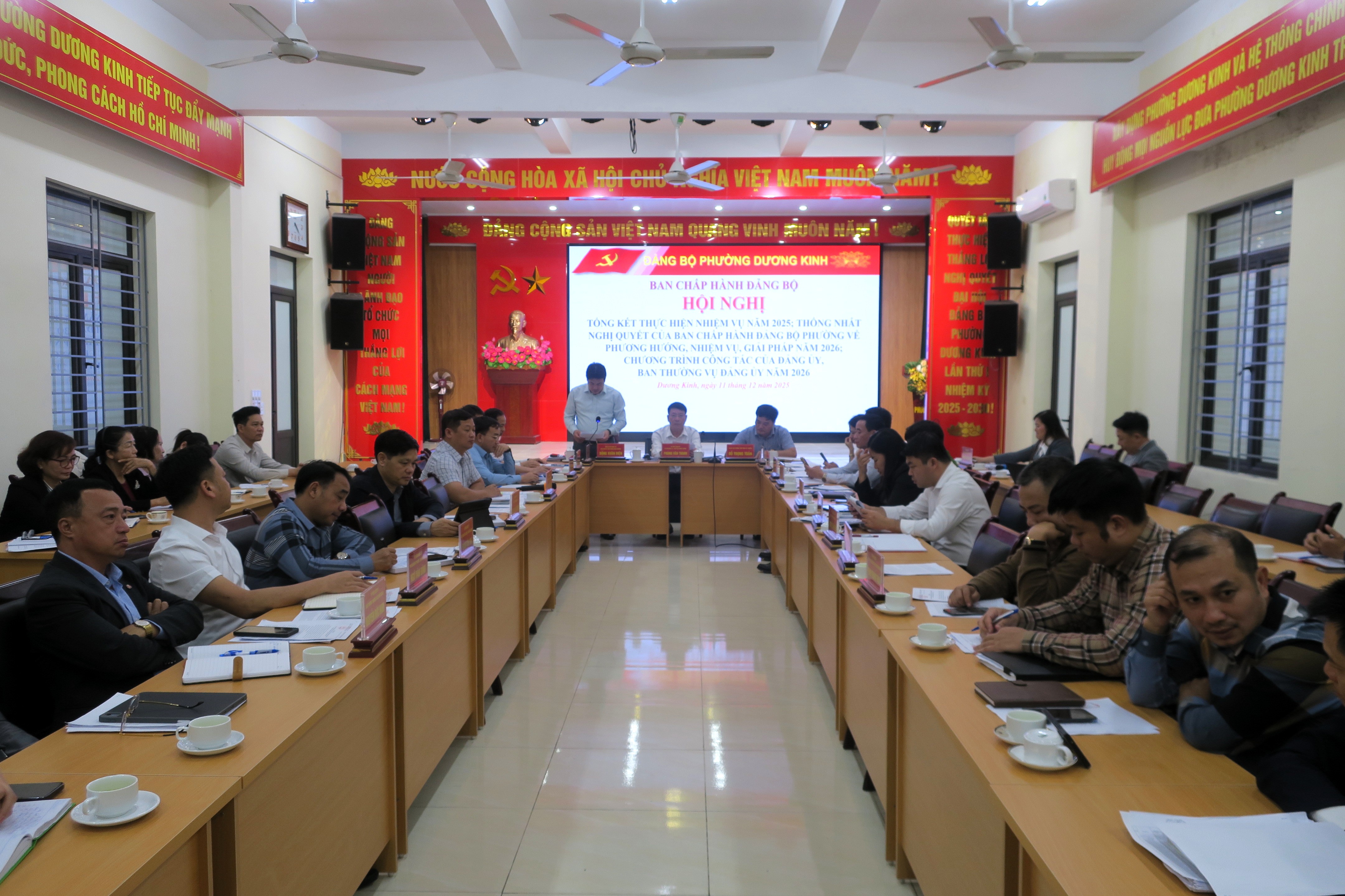 Quang cảnh Hội nghị.Năm 2026, với chủ đề “Đẩy mạnh giải phóng mặt bằng - Sắp xếp bộ máy tinh gọn, hiệu quả - Thúc đẩy chuyển đổi số”, phường Dương Kinh đề ra 20 chỉ tiêu cơ bản trong công tác xây dựng Đảng; phát triển kinh tế - xã hội, quốc phòng – an ninh. Trong đó, phấn đấu kết nạp 37 - 40 đảng viên mới; thành lập mới 01 tổ chức đảng, 01 tổ chức đoàn thể trong các loại hình doanh nghiệp ngoài nhà nước, hợp tác xã, đơn vị sự nghiệp ngoài công lập; xây dựng và duy trì 3 mô hình “Dân vận khéo”; tỷ lệ thu ngân sách nhà nước tăng bình quân 44,4% so với năm 2025; tổng giá trị sản phẩm trên địa bàn tăng bình quân 16,5% so với năm 2025; tỷ lệ giải ngân vốn đầu tư công đạt 100%; thu nhập bình quân đầu người tăng bình quân 10%; không còn hộ nghèo theo chuẩn nghèo Quốc gia…