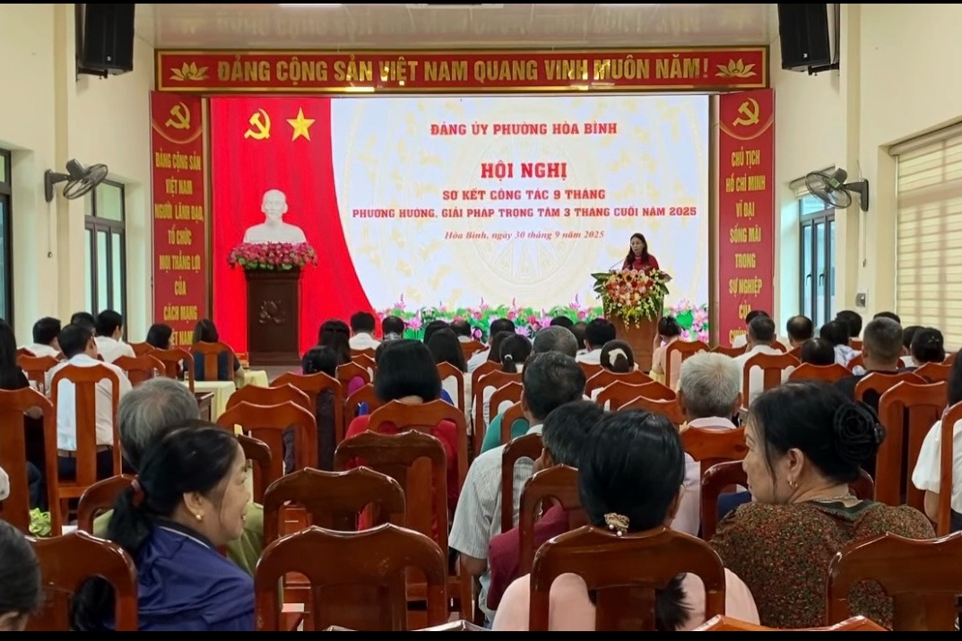 Đồng chí Vũ Hồng Hiên, Ủy viên Ban Thường vụ - Chủ nhiệm Ủy ban Kiểm tra Thành ủy và đồng chí Bùi Thị Ngọc, Bí thư Đảng ủy phường Hòa Bình trao Huy Hiệu Đảng cho đảng viên.Trong bối cảnh vừa thực hiện sắp xếp đơn vị hành chính, ổn định tổ chức bộ máy, với sự chỉ đạo quyết liệt, sự đoàn kết, nỗ lực của cả hệ thống chính trị và Nhân dân, tình hình kinh tế - xã hội 9 tháng đầu năm của phường đã đạt được những kết quả toàn diện. Kinh tế tiếp tục phát triển ổn định, nổi bật là thu ngân sách nhà nước đã vượt dự toán năm, tạo nguồn lực quan trọng cho các nhiệm vụ trọng tâm.Thu ngân sách nhà nước trên địa bàn 9 tháng thực hiện 645,39 tỷ đồng, đạt 75,6% dự toán.