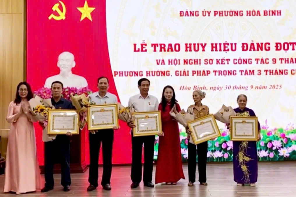 (Haiphong.gov.vn) - Sáng 30/9, Đảng ủy phường Hòa Bình tổ chức Lễ trao tặng Huy hiệu Đảng đợt 2/9; sơ kết công tác 9 tháng, triển khai nhiệm vụ 03 tháng cuối năm 2025. Tới dự có đồng chí Vũ Hồng Hiên, Ủy viên Ban Thường vụ - Chủ nhiệm Ủy ban Kiểm tra Thành ủy.