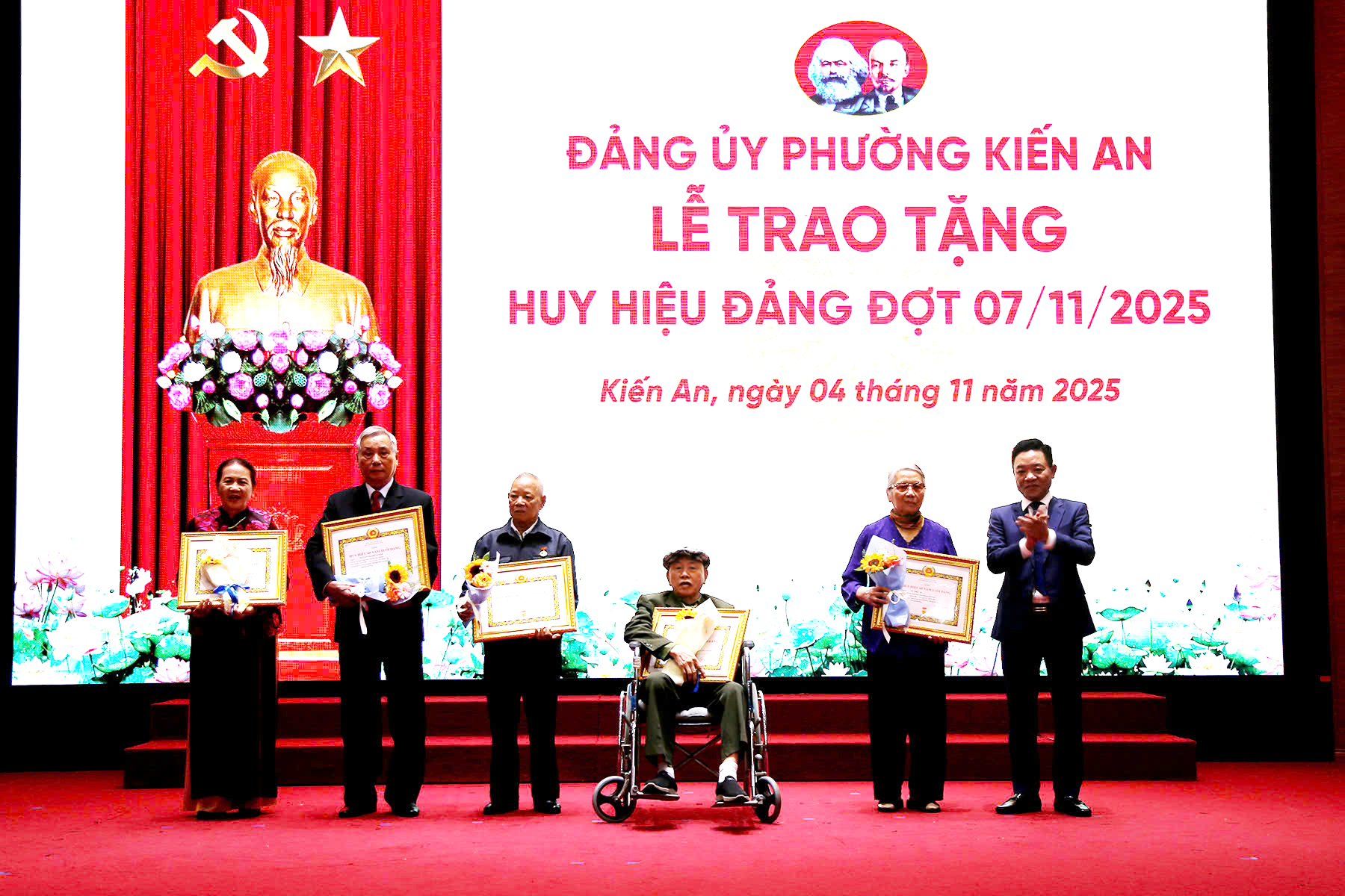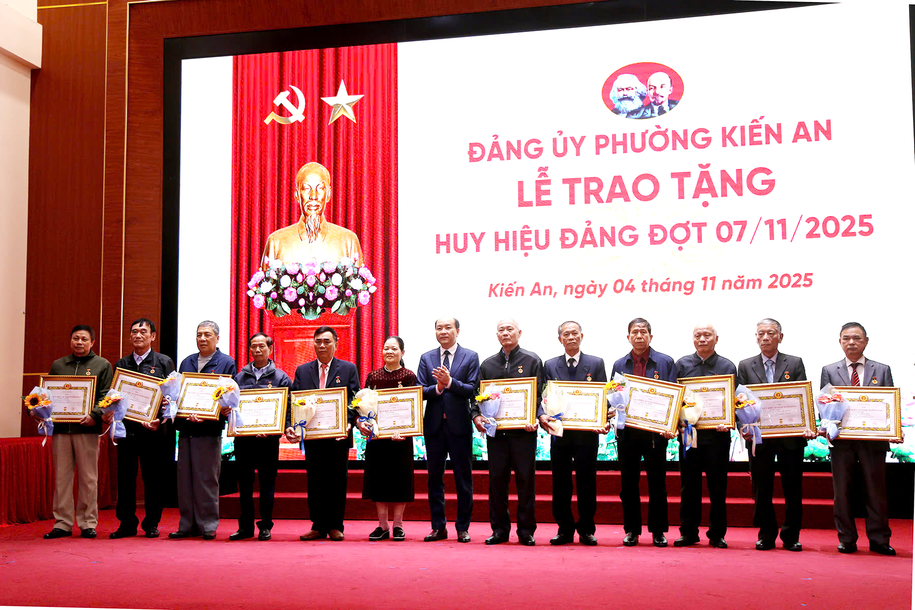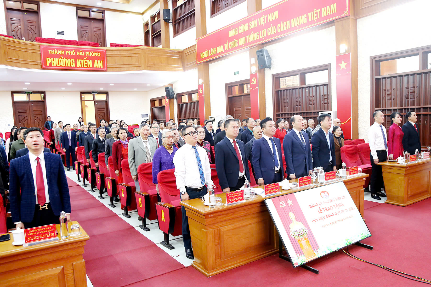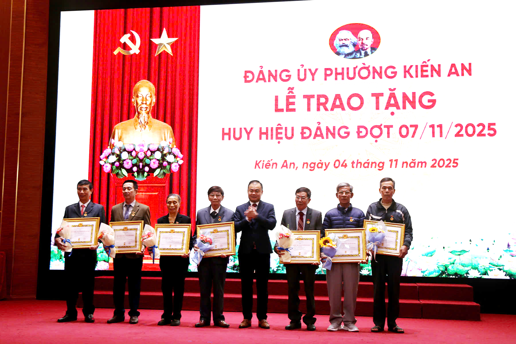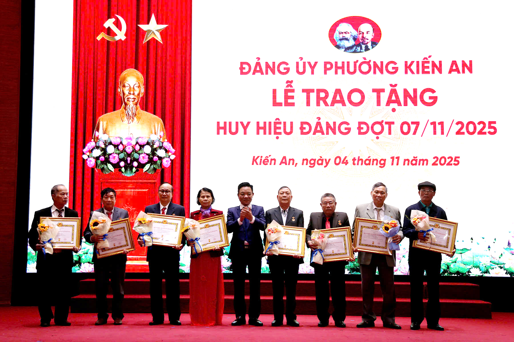 Đại biểu dự Lễ trao Huy hiệu Đảng thực hiện nghi lễ chào cờTại Lễ trao Huy hiệu Đảng đợt 7/11, Đảng bộ phường Kiến An có 43 đảng viên được trao Huy hiệu Đảng trong đó: 01 đảng viên Huy hiệu 65 năm tuổi Đảng; 04 đảng viên Huy hiệu 60 năm tuổi Đảng; 01 đảng viên Huy hiệu 55 năm tuổi Đảng; 07 đảng viên Huy hiệu 50 năm tuổi Đảng; 12 đảng viên Huy hiệu 45 năm tuổi Đảng; 15 đảng viên Huy hiệu 40 năm tuổi Đảng và 03 đảng viên Huy hiệu 30 năm tuổi Đảng.