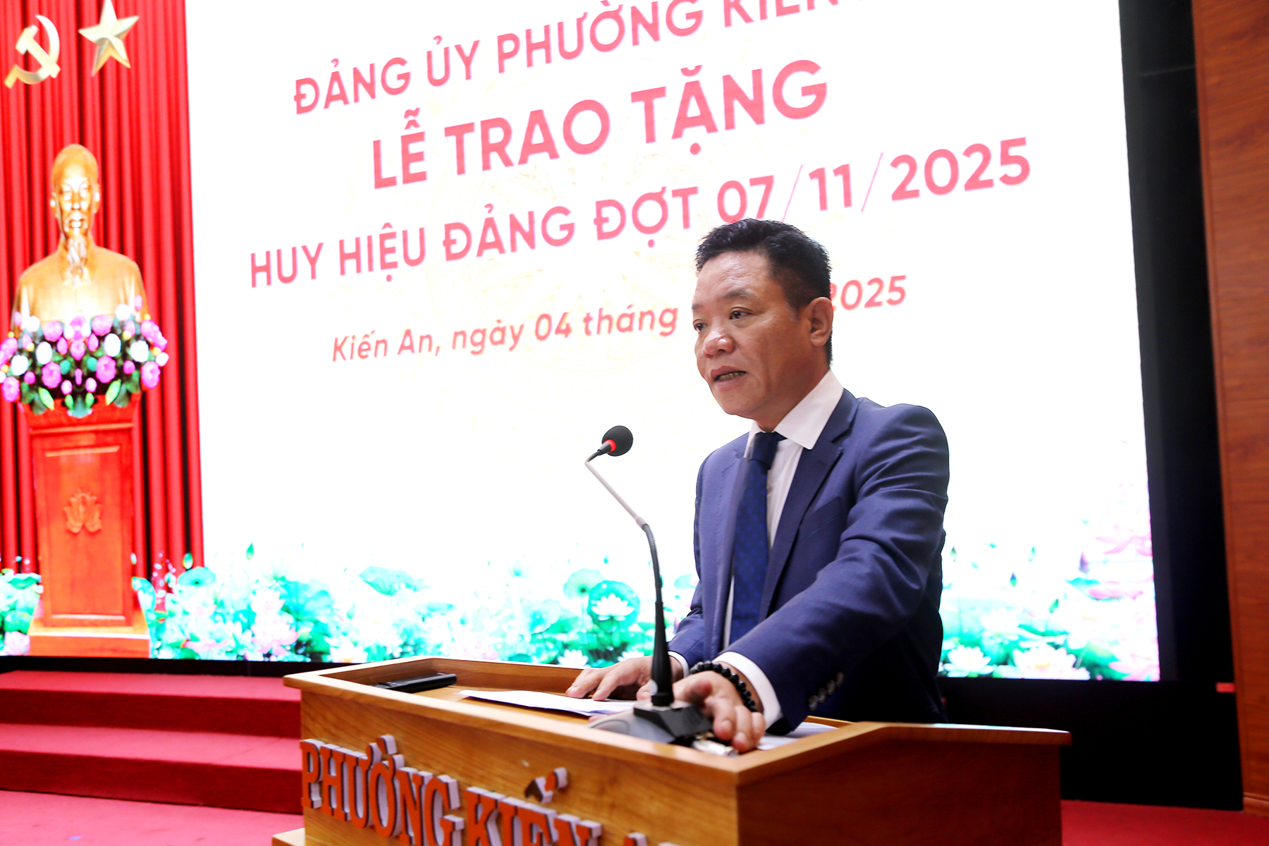 Đồng chí Trần Quang Tuấn – Bí thư Đảng ủy, Chủ tịch HĐND phường phát biểu tại buổi LễPhát biểu tại Lễ trao Huy hiệu Đảng, đồng chí Trần Quang Tuấn – Bí thư Đảng ủy, Chủ tịch HĐND phường chúc mừng các đồng chí đảng viên được nhận huy hiệu Đảng dịp 07/11/2025. Đồng chí nhấn mạnh: Huy hiệu Đảng là phần thưởng cao quý của Đảng Cộng sản Việt Nam, là sự ghi nhận, trân trọng và tri ân sâu sắc đối với những cống hiến, đóng góp to lớn của các đồng chí đảng viên trong suốt quá trình phấn đấu, rèn luyện, cống hiến cho sự nghiệp cách mạng của Đảng, của dân tộc và của địa phương. Phát huy truyền thống vẻ vang của Đảng, của mảnh đất Kiến An anh hùng, mỗi đồng chí đảng viên tiếp tục giữ gìn phẩm chất cách mạng trong sáng, nêu cao tinh thần đảng viên mẫu mực, sáng tạo, tích cực tuyên truyền, vận động Nhân dân, gia đình chấp hành tốt chủ trương, đường lối của Đảng, chính sách, pháp luật của Nhà nước; dù ở bất cứ cương vị nào, các đồng chí vẫn mãi là tấm gương sáng về đạo đức, lối sống; về lòng trung thành tuyệt đối với Đảng, với Tổ quốc và Nhân dân. Bí thư Đảng ủy, Chủ tịch HĐND phường mong muốn và tin tưởng mỗi đồng chí đảng viên  học tập các thế hệ đi trước, tiếp tục rèn luyện, phấn đấu, đóng góp trí tuệ và nhiệt huyết để xây dựng phường Kiến An ngày càng phát triển, văn minh, hiện đại và thực hiện tốt mô hình chính quyền địa phương hai cấp đảm bảo hiệu lực, hiệu quả.