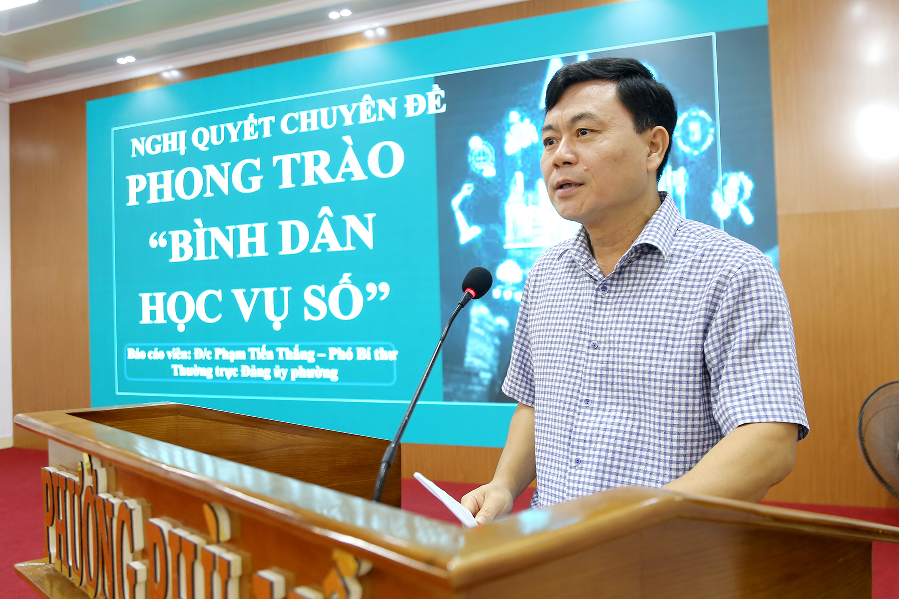 Phó Bí thư Thường trực Đảng ủy phường Phạm Tiến Thắng báo cáo tại Hội nghịCũng tại Hội nghị, đồng chí Phạm Tiến Thắng - Phó Bí thư Thường trực Đảng ủy phường đã quán triệt, triển khai thực hiện Nghị quyết chuyên đề về việc lãnh đạo, chỉ đạo triển khai thực hiện phong trào “Bình dân học vụ số”.
