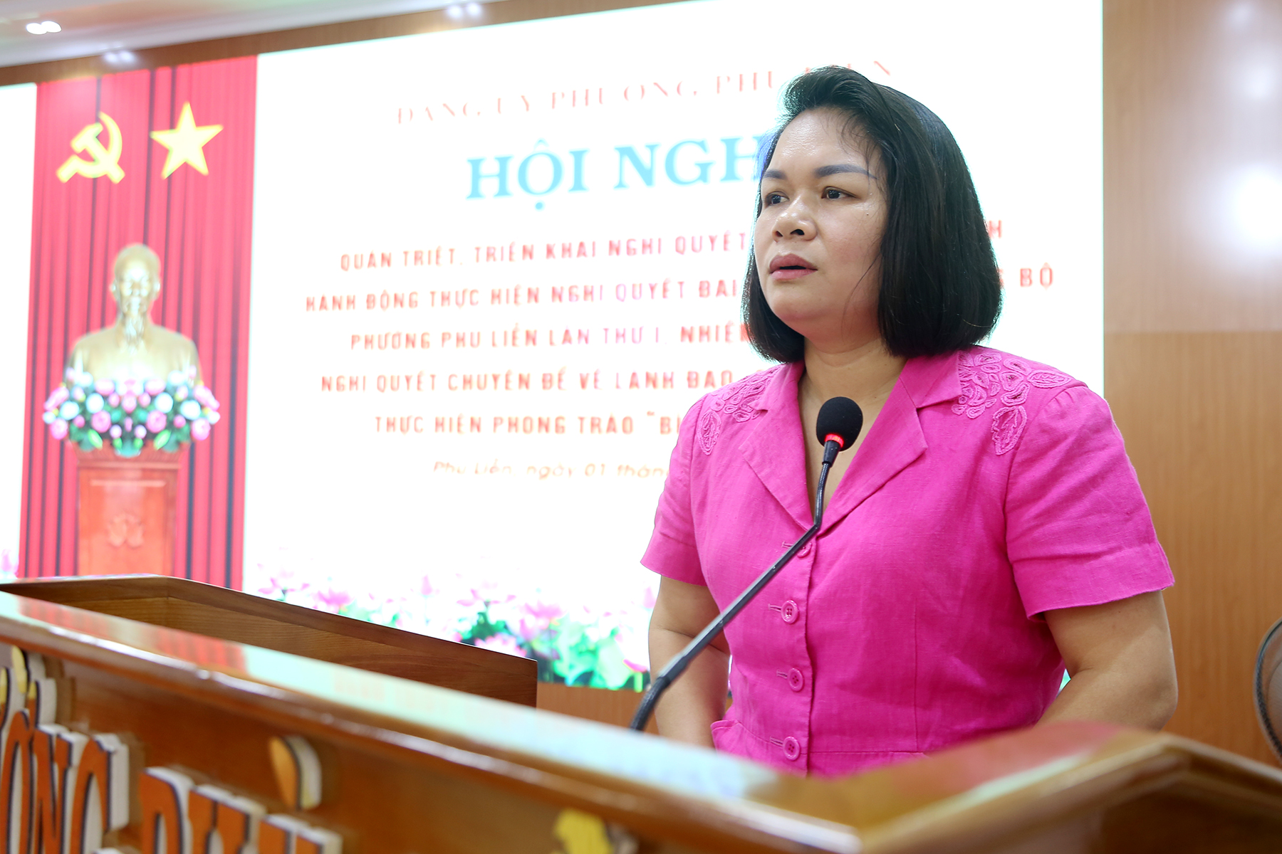 (Haiphong,gov.vn) – Sáng 1/10, Ban Thường vụ Đảng ủy phường Phù Liễn tổ chức Hội nghị quán triệt, tuyên truyền và triển khai thực hiện Nghị quyết Đại hội Đảng bộ phường lần thứ nhất (nhiệm kỳ 2025-2030), chương trình hành động của Ban Chấp hành Đảng bộ phường và Nghị quyết chuyên đề về việc lãnh đạo, chỉ đạo triển khai thực hiện phong trào “Bình dân học vụ số." Đồng chí Bùi Thị Tuyết Mai - Bí thư Đảng ủy, Chủ tịch HĐND phường chủ trì và trực tiếp báo cáo tại Hội nghị. Cùng dự có các đồng chí: Phạm Văn Diện - Phó Bí thư Đảng ủy, Chủ tịch UBND phường; Phạm Tiến Thắng - Phó Bí thư Thường trực Đảng ủy phường; các đồng chí Ủy viên Ban Thường vụ, Ủy viên Ban Chấp hành, đại diện lãnh đạo các phòng, ban, đơn vị, các tổ chức chính trị xã hội phường; Bí thư chi bộ, Tổ trưởng, trưởng ban Công tác mặt trận các Tổ dân phố trên địa bàn.