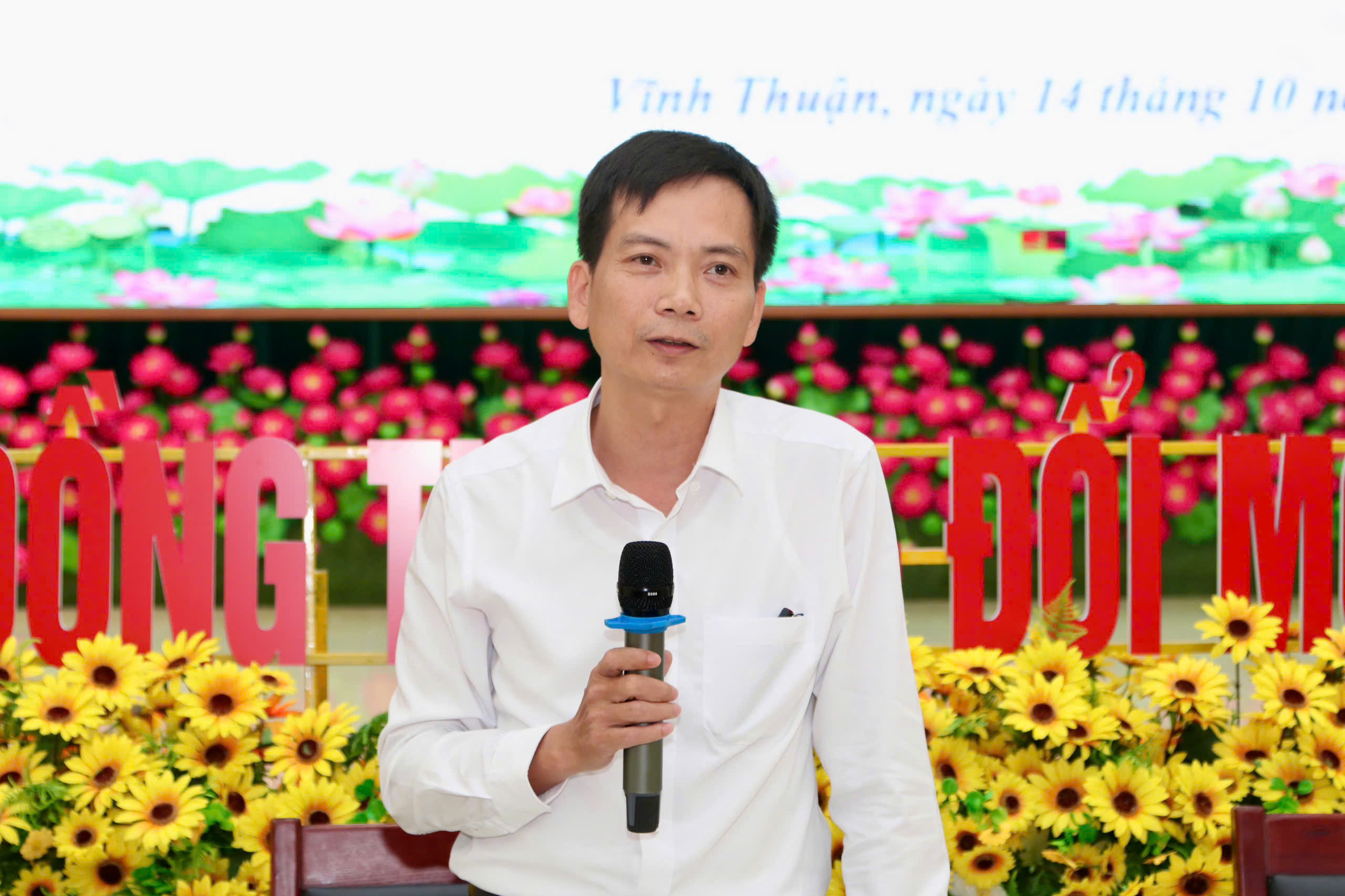 Đồng chí Đinh Phú Hiếu, Chủ tịch UBND xã Vĩnh Thuận phát biểu tại Hội nghị