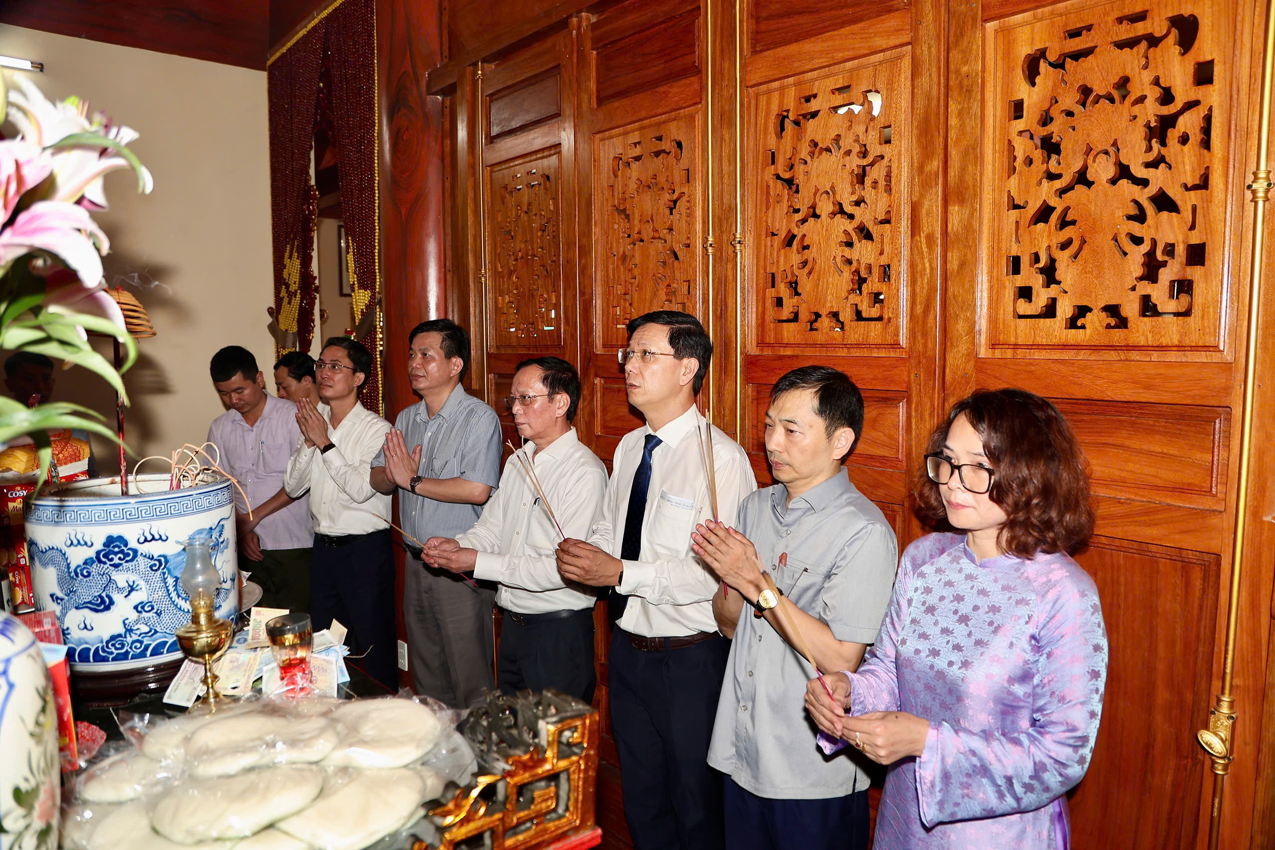 Các đồng chí lãnh đạo dâng hương tưởng niệm các vị Thành hoàng và Anh linh các Anh hùng liệt sỹ.Đồng chí đề nghị cấp ủy, chính quyền địa phương tăng cường hiệu lực, hiệu quả quản lý nhà nước về di sản văn hóa; thực hiện nghiêm quy định của pháp luật, kịp thời ngăn chặn, xử lý những hành vi xâm hại di tích. Chú trọng công tác bảo tồn gắn với phát huy giá trị di tích; đẩy mạnh tuyên truyền, giáo dục truyền thống lịch sử, văn hóa cho Nhân dân, đặc biệt là thế hệ trẻ, qua đó nâng cao nhận thức và trách nhiệm cộng đồng trong việc gìn giữ di sản.