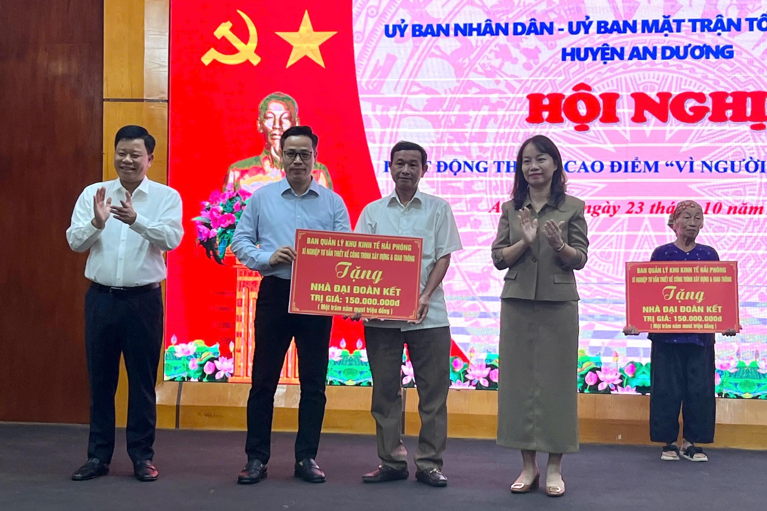Chương trình trao tặng kinh phí xây dựng nhà Đại đoàn kết cho người dân huyện An Dương.Phát biểu tại Hội nghị, đồng chí Lê Trung Kiên, Ủy viên Ban Thường vụ Thành ủy, Trưởng Ban Quản lý Khu kinh tế Hải Phòng cảm ơn các doanh nghiệp đồng hành, chung tay cùng thành phố, địa phương thực hiện công tác xóa đói giảm nghèo, bảo đảm an sinh xã hội. Đồng thời, đề nghị huyện An Dương tăng cường tuyên truyền, vận động, huy động doanh nghiệp, cán bộ, công chức, các tầng lớp Nhân dân trong và ngoài huyện ủng hộ quỹ vì người nghèo; tiếp tục triển khai hiệu quả các giải pháp xóa đói giảm nghèo theo chỉ đạo của Trung ương, thành phố để không ai bị bỏ lại phía sau và sớm hoàn thành mục tiêu không còn hộ nghèo./.