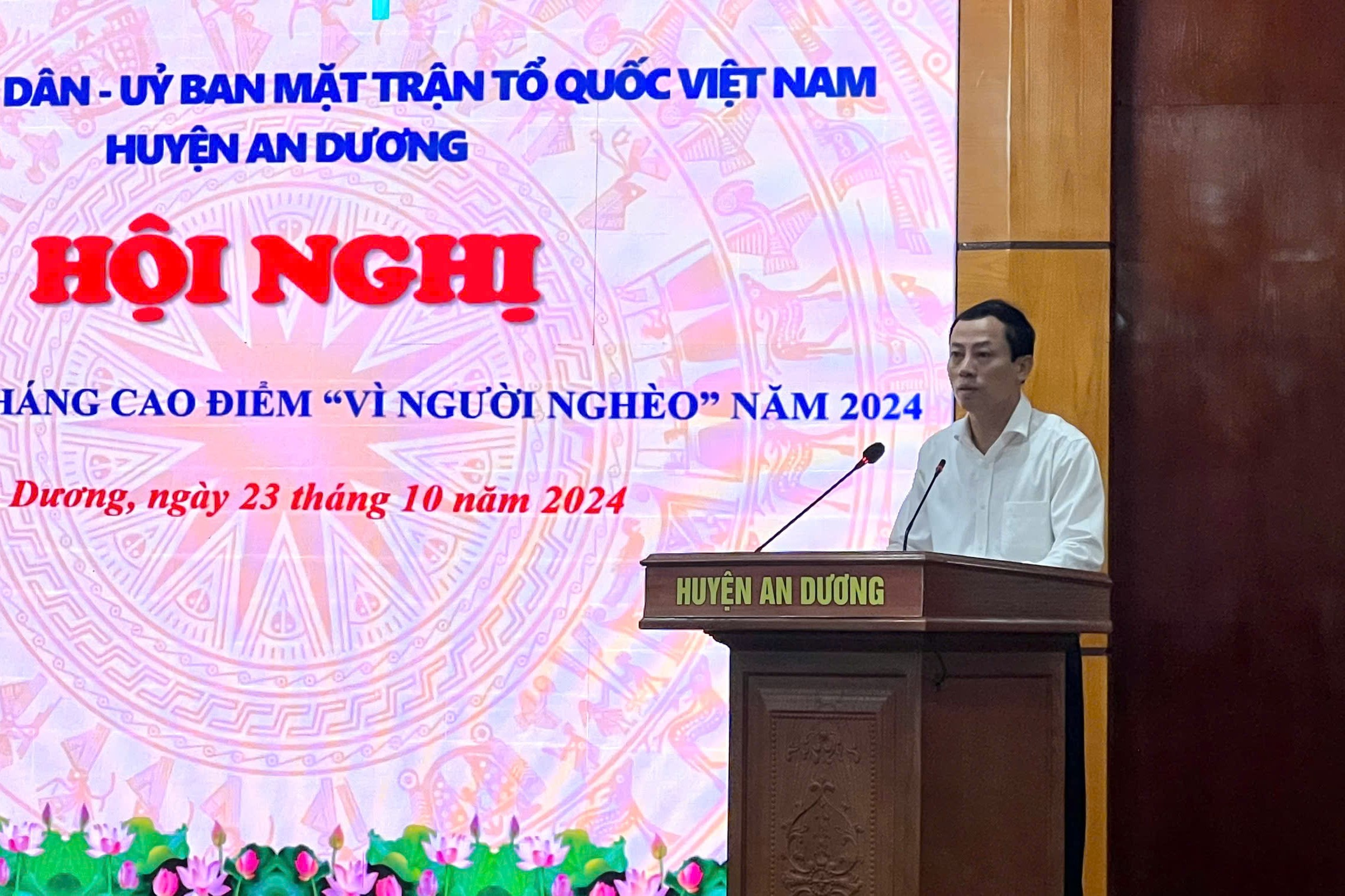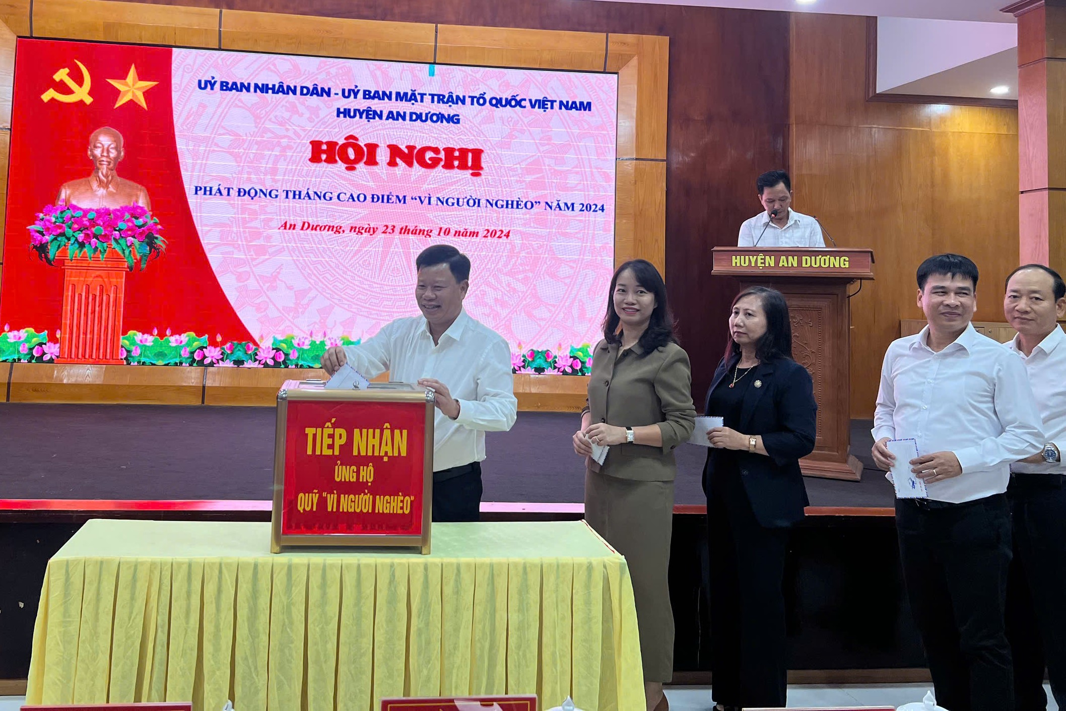Hưởng ứng Tháng cao điểm “Vì người nghèo” năm 2024, phong trào “Cả nước chung tay vì người nghèo, không để ai bị bỏ lại phía sau” và phong trào thi đua “Chung tay xóa nhà tạm, nhà dột nát trên phạm vi cả nước trong năm 2025” do Thủ tướng Chính phủ phát động, UBND, Ủy ban MTTQ Việt Nam huyện An Dương kêu gọi các doanh nghiệp, doanh nhân, cơ quan, đơn vị, tổ chức, cá nhân và các tầng lớp Nhân dân trong và ngoài địa bàn huyện tích cực tham gia đóng góp ủng hộ Quỹ “Vì người nghèo” để thiết thực giúp đỡ về vật chất và tinh thần cho người nghèo vượt qua khó khăn, vươn lên xây dựng cuộc sống ấm no, hạnh phúc. Mức vận động ủng hộ, mỗi cán bộ, công chức, viên chức, người lao động trong các đơn vị sự nghiệp, doanh nghiệp, lực lượng vũ trang tham gia ủng hộ ít nhất 1 ngày công; mỗi hộ gia đình trên địa bàn huyện tham gia ủng hộ 15.000 đồng/hộ…