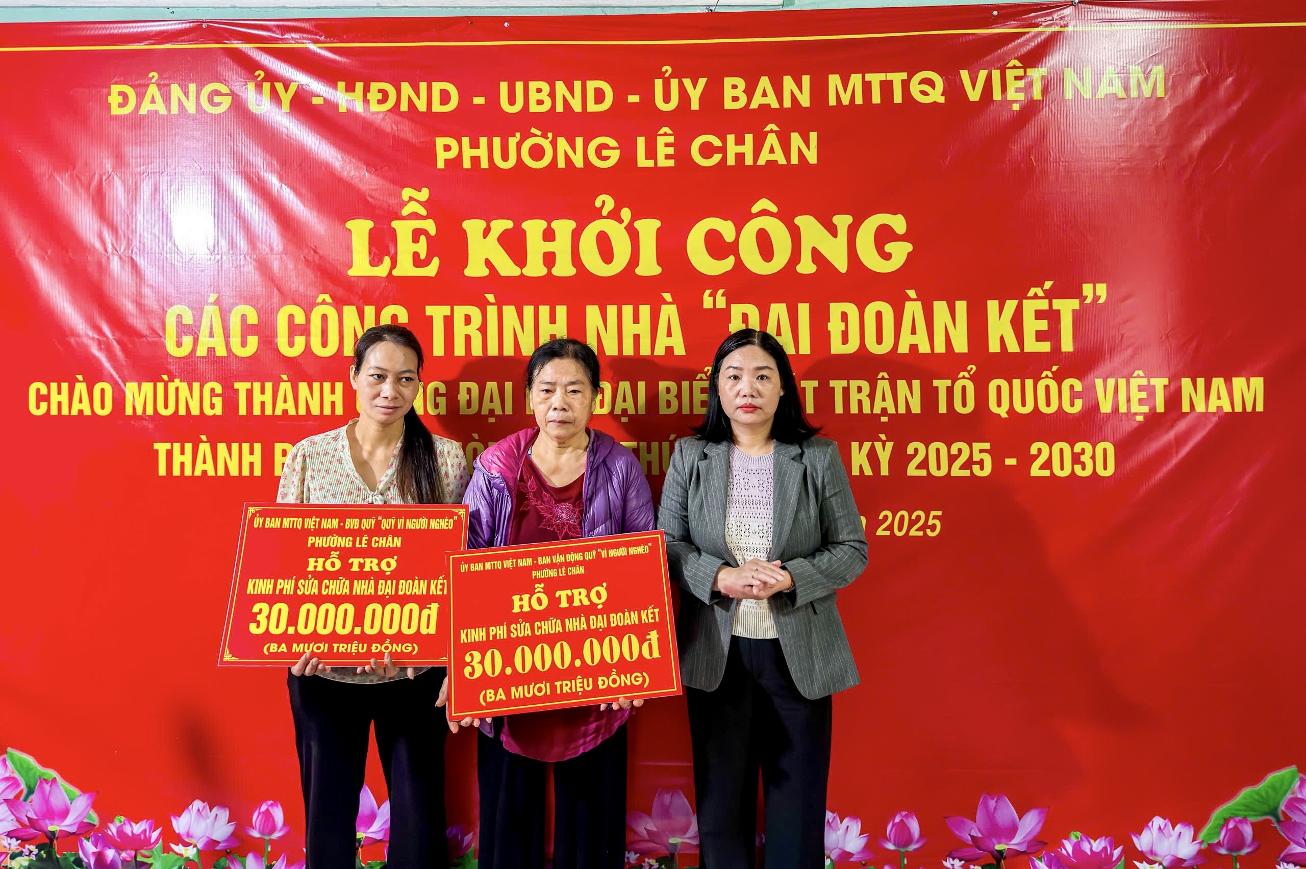 Ủy ban MTTQ Việt Nam phường Lê Chân trao kinh phí hỗ trợ cho 2 gia đình.Với tinh thần “Tương thân tương ái”, Ủy ban MTTQ Việt Nam phường đã phát động phong trào quyên góp, ủng hộ kinh phí sửa chữa nhà “Đại đoàn kết” cho hộ gia đình có hoàn cảnh đặc biệt khó khăn, và đã lựa chọn hỗ trợ gia đình ông Nguyễn Đức Thành Chung, số 8A/58 Nguyễn Đức Cảnh và bà Phùng Thị Kiến, số nhà 15/143 Hai Bà Trưng.