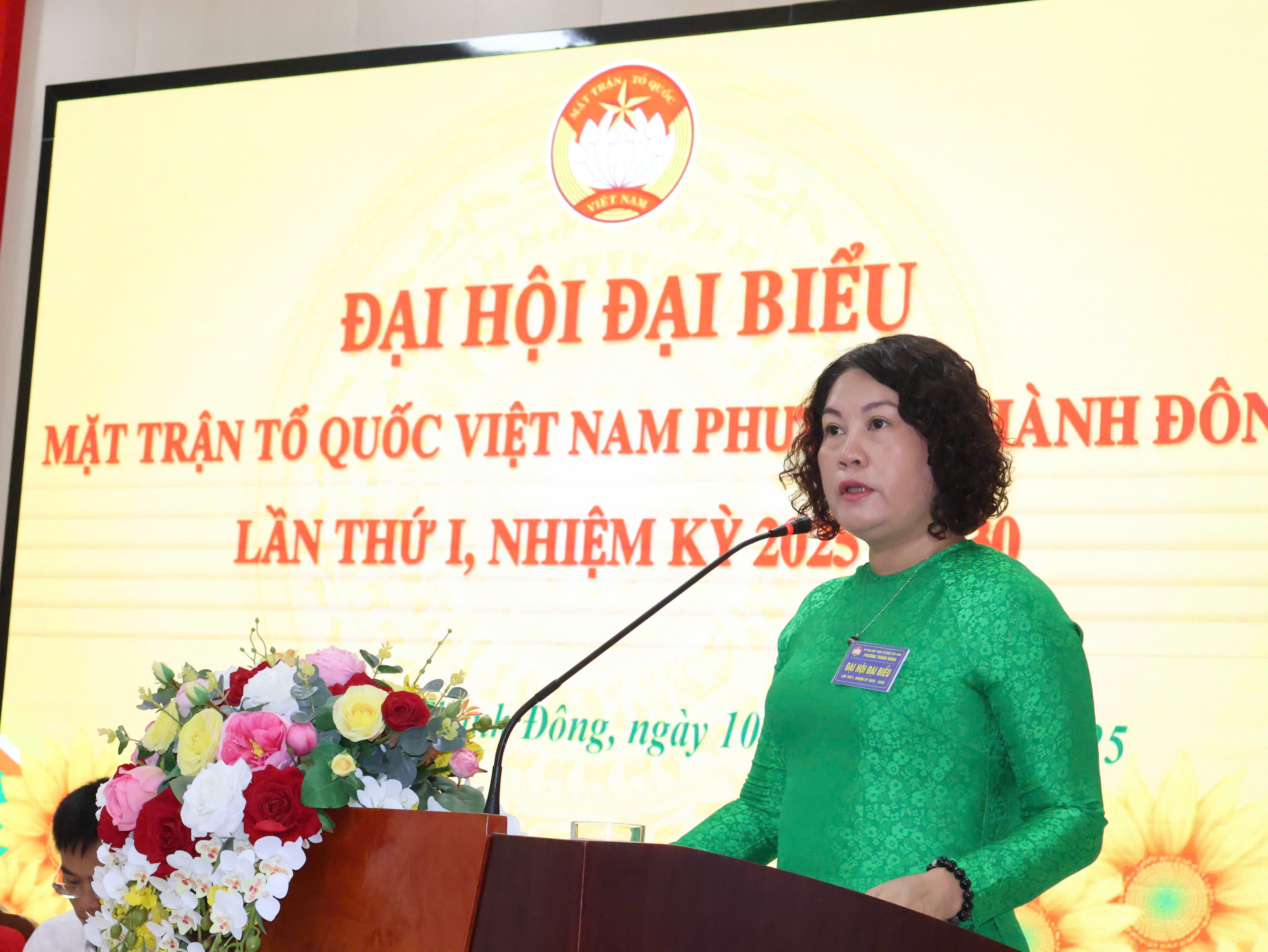 Đồng chí Ngô Thị Thanh Hòa, Bí thư Đảng ủy, Chủ tịch HĐND phường Thành Đông phát biểu chỉ đạo tại Đại hộiVề phương hướng nhiệm kỳ 2025-2030, Đại hội đề ra 11 chỉ tiêu và 6 nội dung trọng tâm của chương trình hành động. Trong đó, phát huy vai trò nòng cốt chính trị của Ủy ban MTTQ Việt Nam, tiếp tục đổi mới mạnh mẽ về nội dung và phương thức hoạt động, đa dạng hình thức tuyên truyền, vận động, tập hợp củng cố vững chắc khối đại đoàn kết toàn dân tộc. Tăng cường đồng thuận, phát huy dân chủ, thực hiện tốt chức năn đại diện, bảo vệ quyền và lợi ích hợp pháp, chính đáng của Nhân dân. Tiếp tục nâng cao chất lượng, hiệu quả giám sát và phản biện xã hội, tham gia đấu tranh phòng, chống tham nhũng, lãng phí, tiêu cực, tích cực xây dựng Đảng, xây dựng chính quyền vững mạnh. Đẩy mạnh phong trào thi đua yêu nước, các cuộc vận động, huy động nguồn lực, tiềm năng, sự sáng tạo củaNnhân dân vào tham gia phát triển kinh tế - xã hội, giữ vững an ninh, quốc phòng, đảm bảo an sinh xã hội, xây dựng khu dân cư ấm no, hạnh phúc.