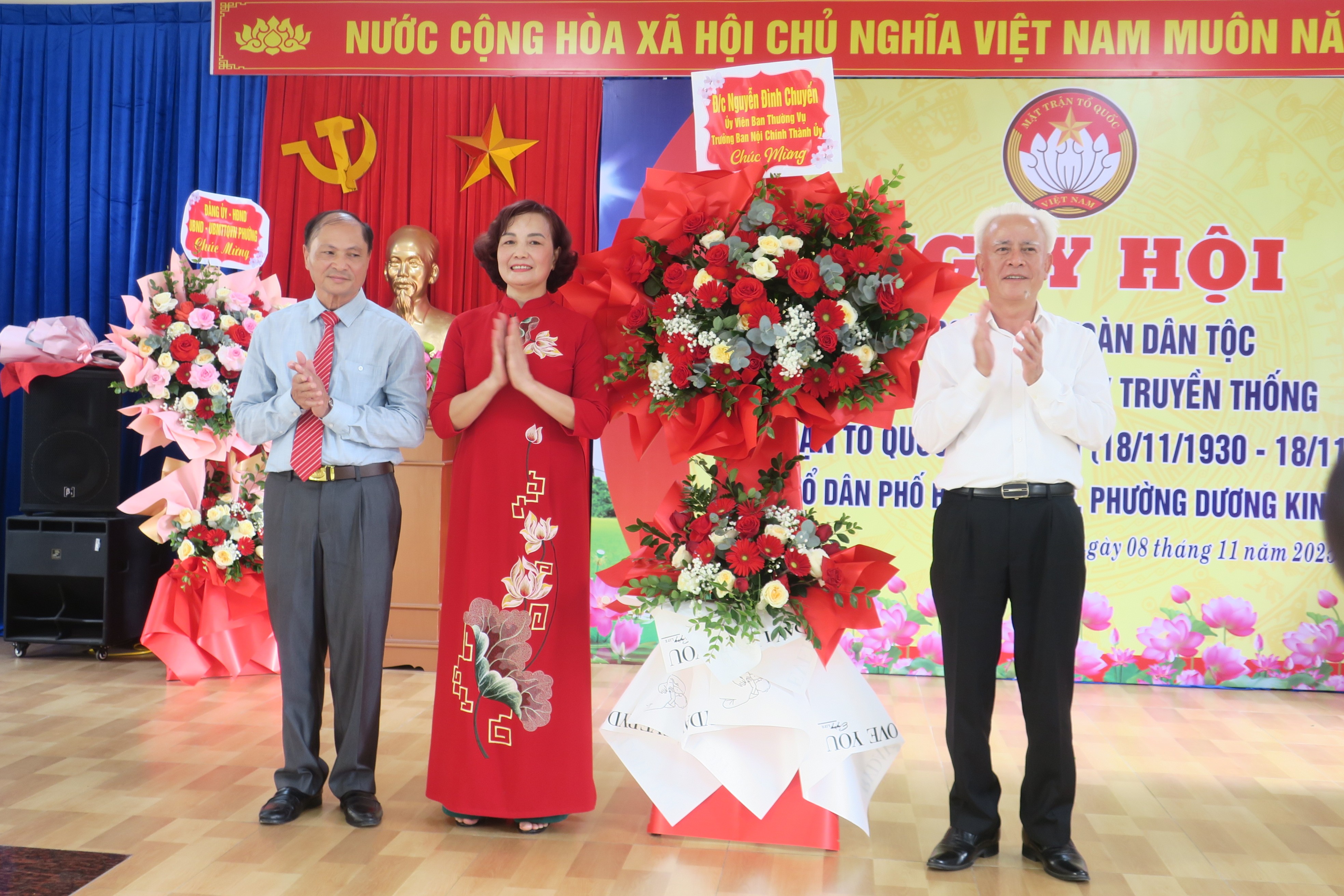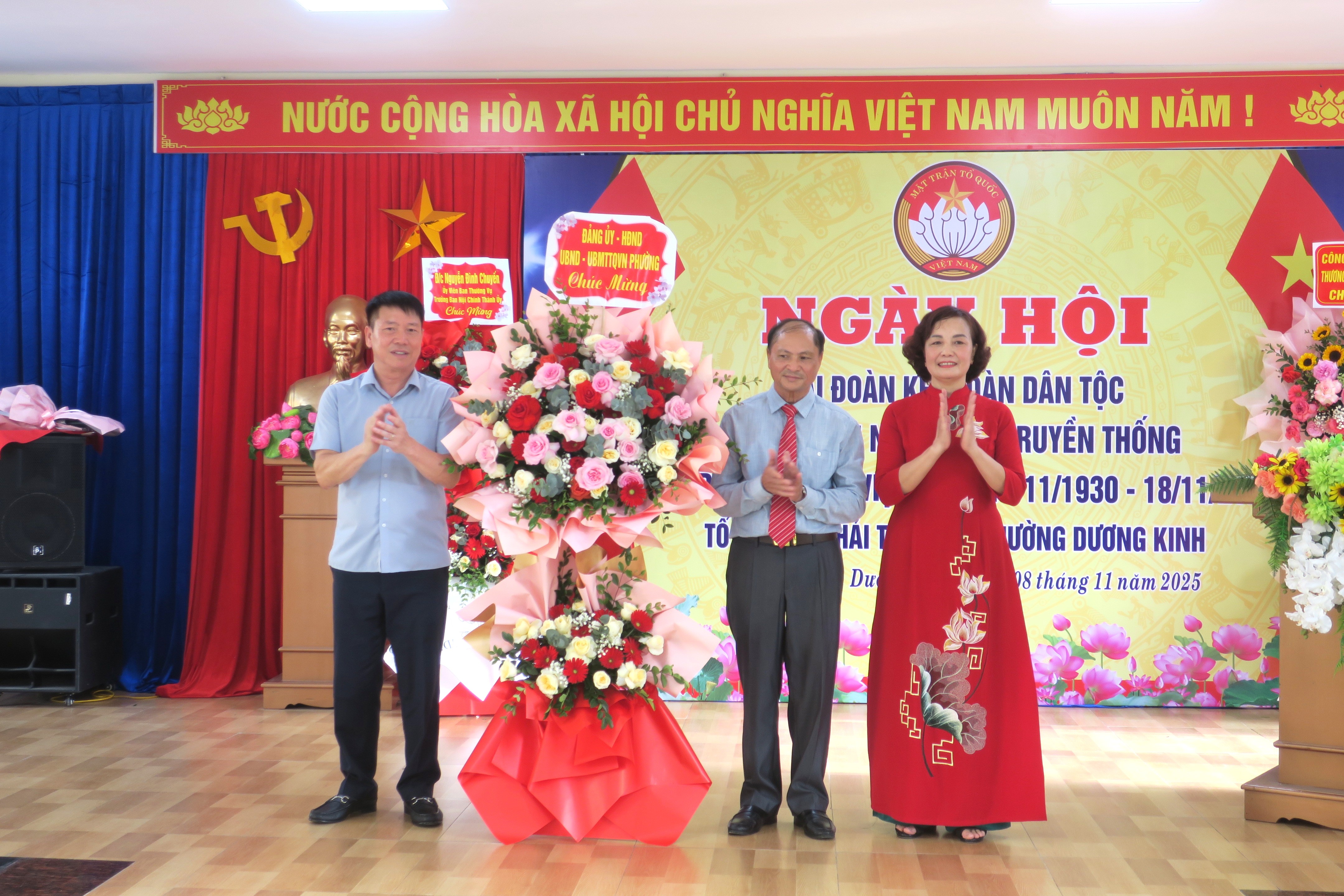 Đồng chí Phùng Văn Thanh, Bí thư Đảng ủy, Chủ tịch HĐND phường tặng hoa chúc mừng Ngày hội.Nhân dịp này, Ủy ban MTTQ Việt Nam phường Dương Kinh tặng giấy khen cho 1 tập thể và 2 cá nhân tham gia tích cực Cuộc vận động “Toàn dân đoàn kết xây dựng nông thôn mới, đô thị văn minh” năm 2025; tặng quà cho 2 hộ gia đình khó khăn, các hộ gia đình tiêu biểu và học sinh - sinh viên đạt thành tích cao trong học tập…
