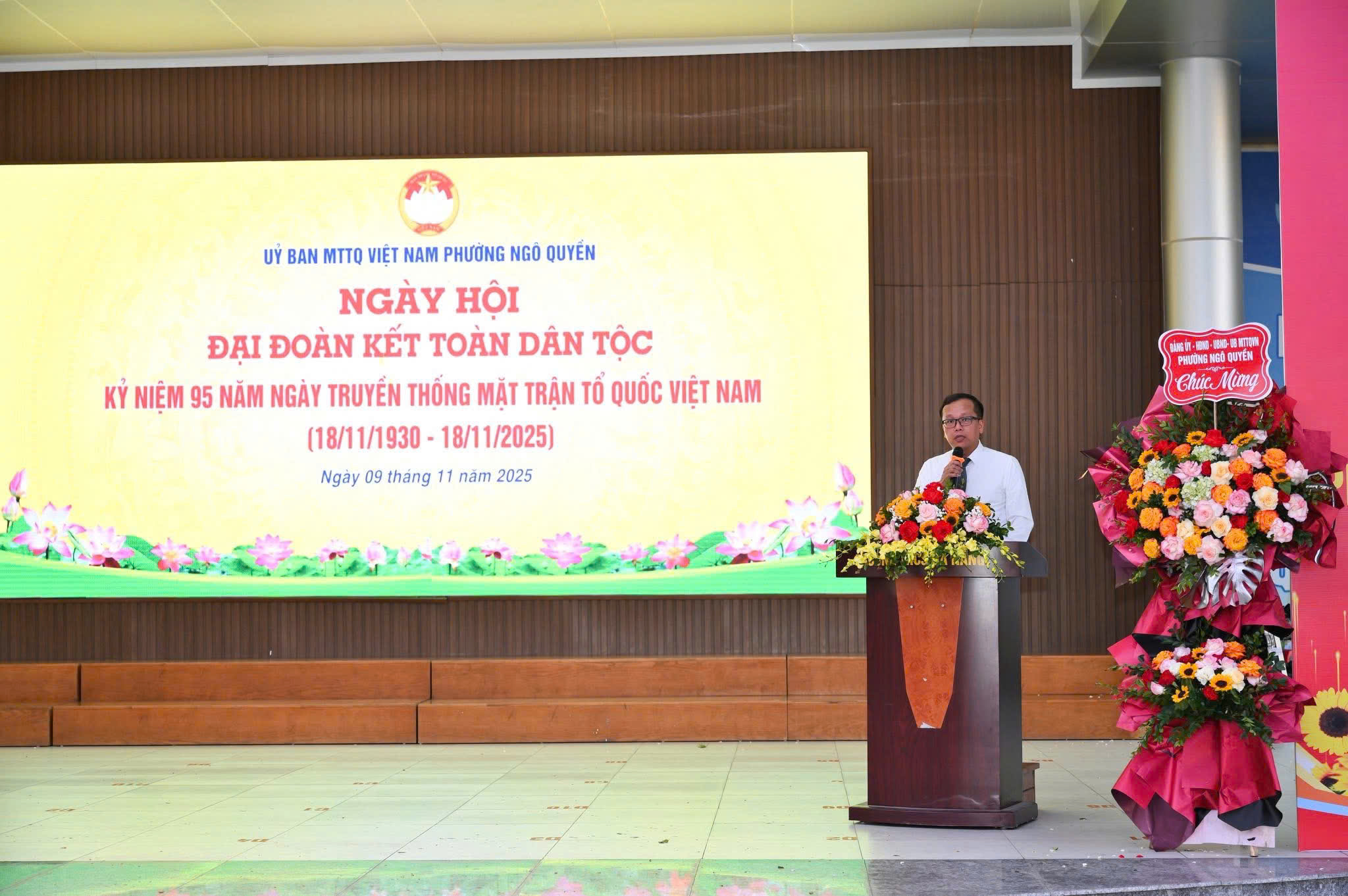 Đồng chí Cáp Trọng Tuấn, Bí thư Đảng ủy phường Ngô Quyền phát biểu tại Ngày hội.Phát biểu tại Ngày hội, đồng chí Cáp Trọng Tuấn, Bí thư Đảng ủy phường Ngô Quyền nhấn mạnh: truyền thống đoàn kết, tinh thần yêu nước, ý thức trách nhiệm của mỗi người dân luôn được khơi dậy và phát huy mạnh mẽ trong công cuộc xây dựng, phát triển địa phương. Các phong trào, cuộc vận động của Mặt trận đã thực sự đi vào chiều sâu, mang lại hiệu quả thiết thực, tạo sự đồng thuận, gắn bó giữa chính quyền và Nhân dân, góp phần xây dựng phường Ngô Quyền ngày càng giàu đẹp, văn minh, hiện đại.