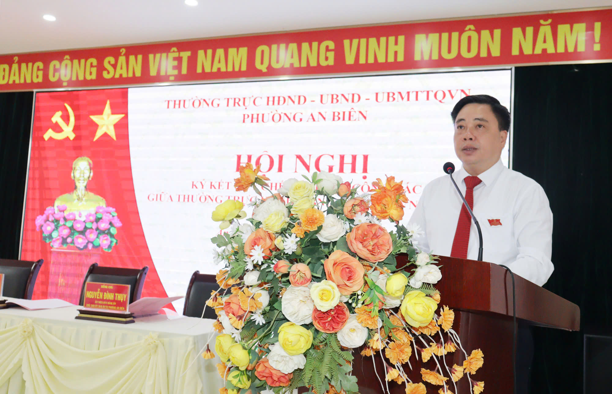 (Haiphong.gov.vn) - Sáng 22/4, Thường trực HĐND - UBND - Ủy ban MTTQ Việt Nam phường An Biên tổ chức Hội nghị ký kết Quy chế phối hợp công tác giữa 3 cơ quan. Đồng chí Nguyễn Văn Thành, Bí thư Đảng ủy, Chủ tịch HĐND phường chủ trì Hội nghị.