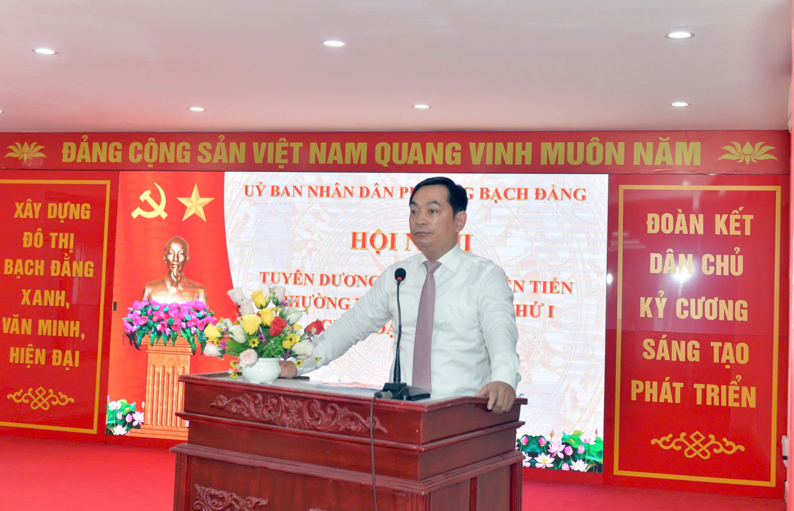 Đồng chí Nguyễn Hoàng Minh, Phó Bí thư Đảng ủy - Chủ tịch UBND phường Bạch Đằng phát biểu tại hội nghị.Đặc biệt, chú trọng phát huy tinh thần tự giác, sáng tạo của cán bộ, công chức, viên chức, người lao động và nhân dân; tăng cường công tác kiểm tra, giám sát, sơ kết, tổng kết, từ đó nhân rộng các mô hình hay, cách làm hiệu quả. Đồng thời, thường xuyên bồi dưỡng chuyên môn nghiệp vụ cho đội ngũ cán bộ làm công tác thi đua khen thưởng, nhằm nâng cao chất lượng tham mưu.
