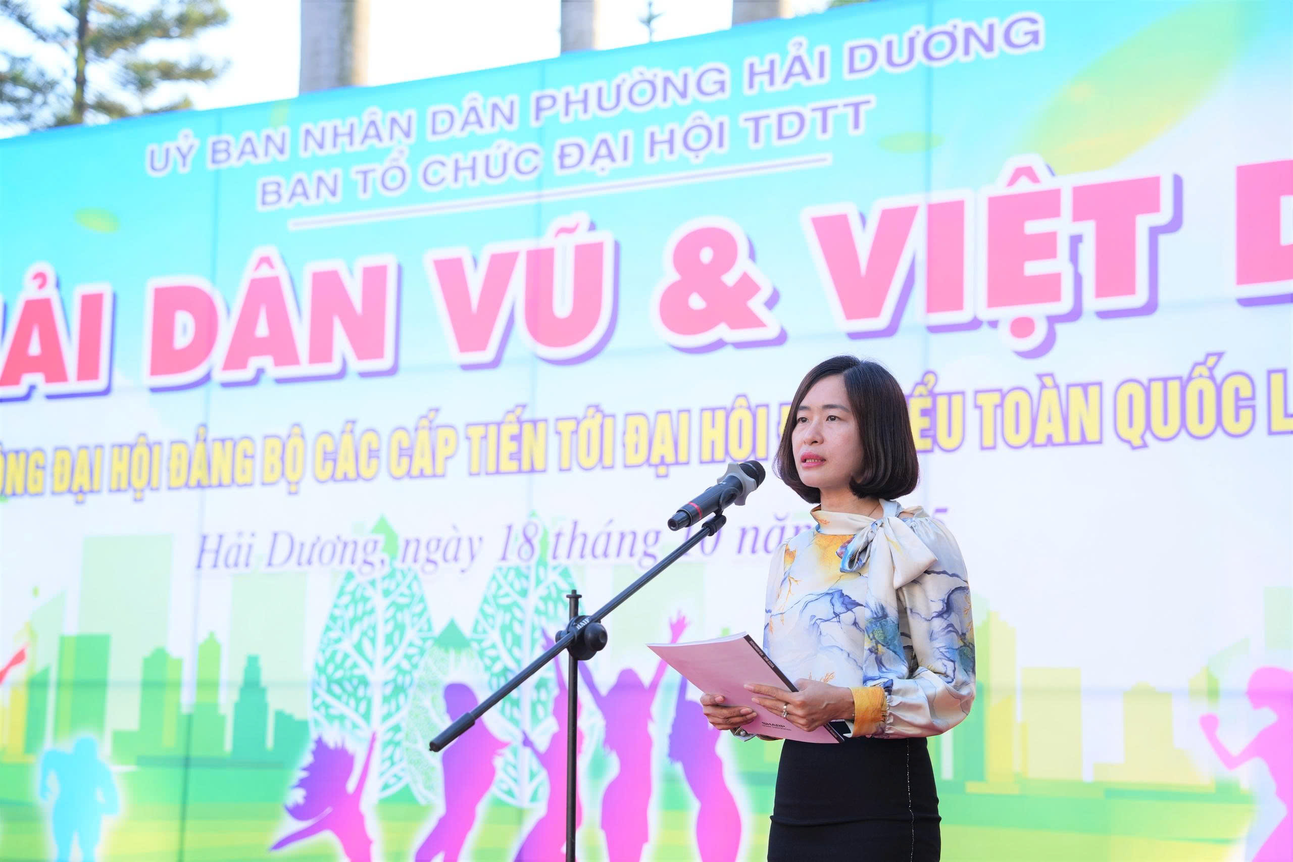Bà Nguyễn Thị Thu Thủy, Phó Chủ tịch Thường trực UBND phường, Trưởng Ban Chỉ đạo Đại hội Thể dục Thể thao phường Hải Dương phát biểu khai mạc giải