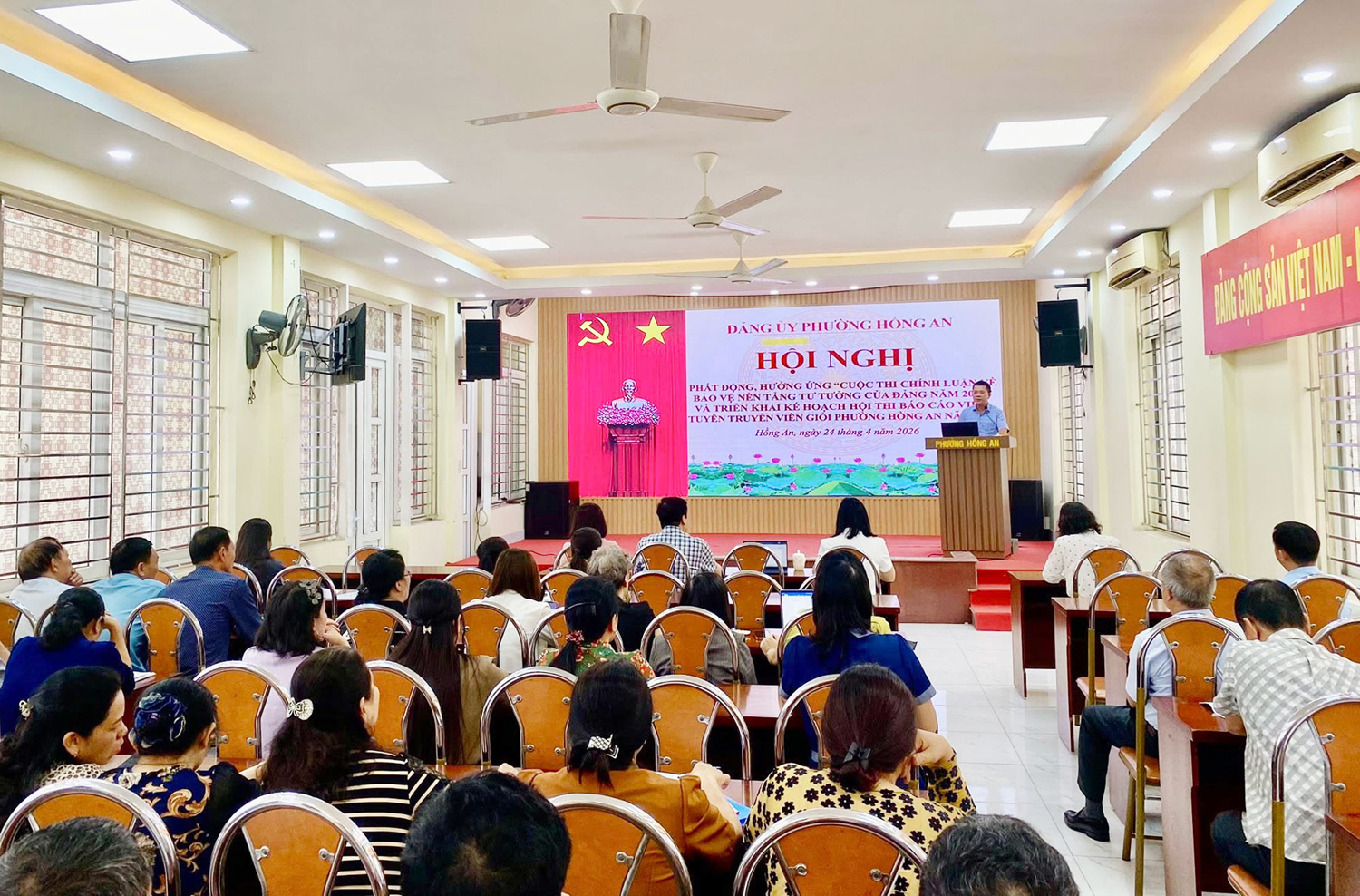 (Haiphong.gov.vn) - Sáng 24/4, Đảng ủy phường Hồng An tổ chức Hội nghị phát động, hưởng ứng Cuộc thi chính luận về bảo vệ nền tảng tư tưởng của Đảng năm 2026 và triển khai kế hoạch Hội thi báo cáo viên, tuyên truyền viên giỏi phường năm 2026. Đồng chí Lê Văn Mịch, Phó Bí thư Thường trực Đảng ủy phường chủ trì Hội nghị.