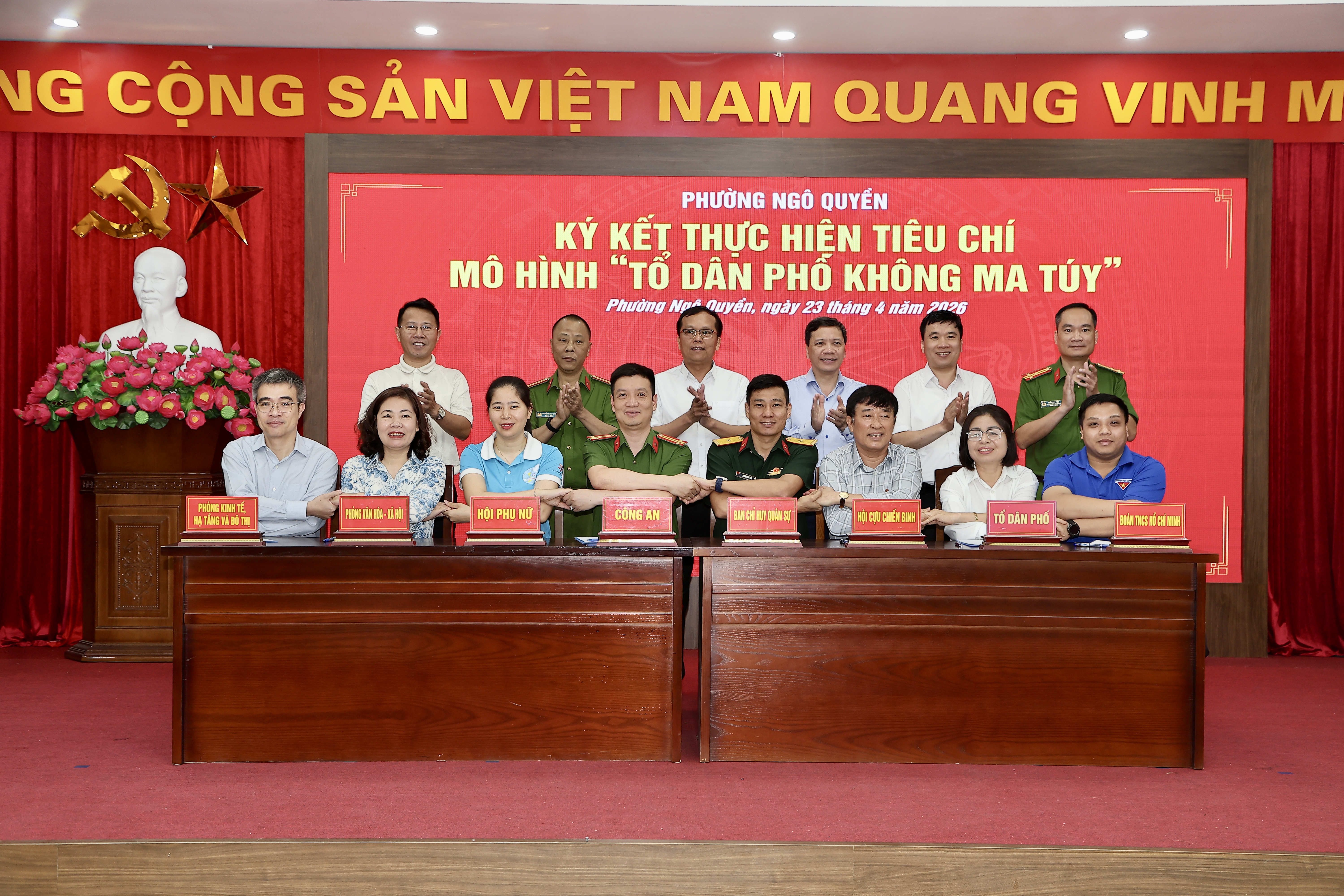 Ký kết thực hiện mô hình “ Tổ dân phố không ma tuý”Năm 2026, phường Ngô Quyền lựa chọn 16 tổ dân phố để triển khai xây dựng mô hình với phương châm “đi từng ngõ, gõ từng nhà, rà từng đối tượng”, quyết tâm không để phát sinh điểm nóng về ma túy. Đây là bước khởi đầu quan trọng để phường phấn đấu xây dựng “Phường không ma túy” vào năm 2030, góp phần bảo đảm an ninh trật tự, xây dựng môi trường sống an toàn, lành mạnh cho Nhân dân.