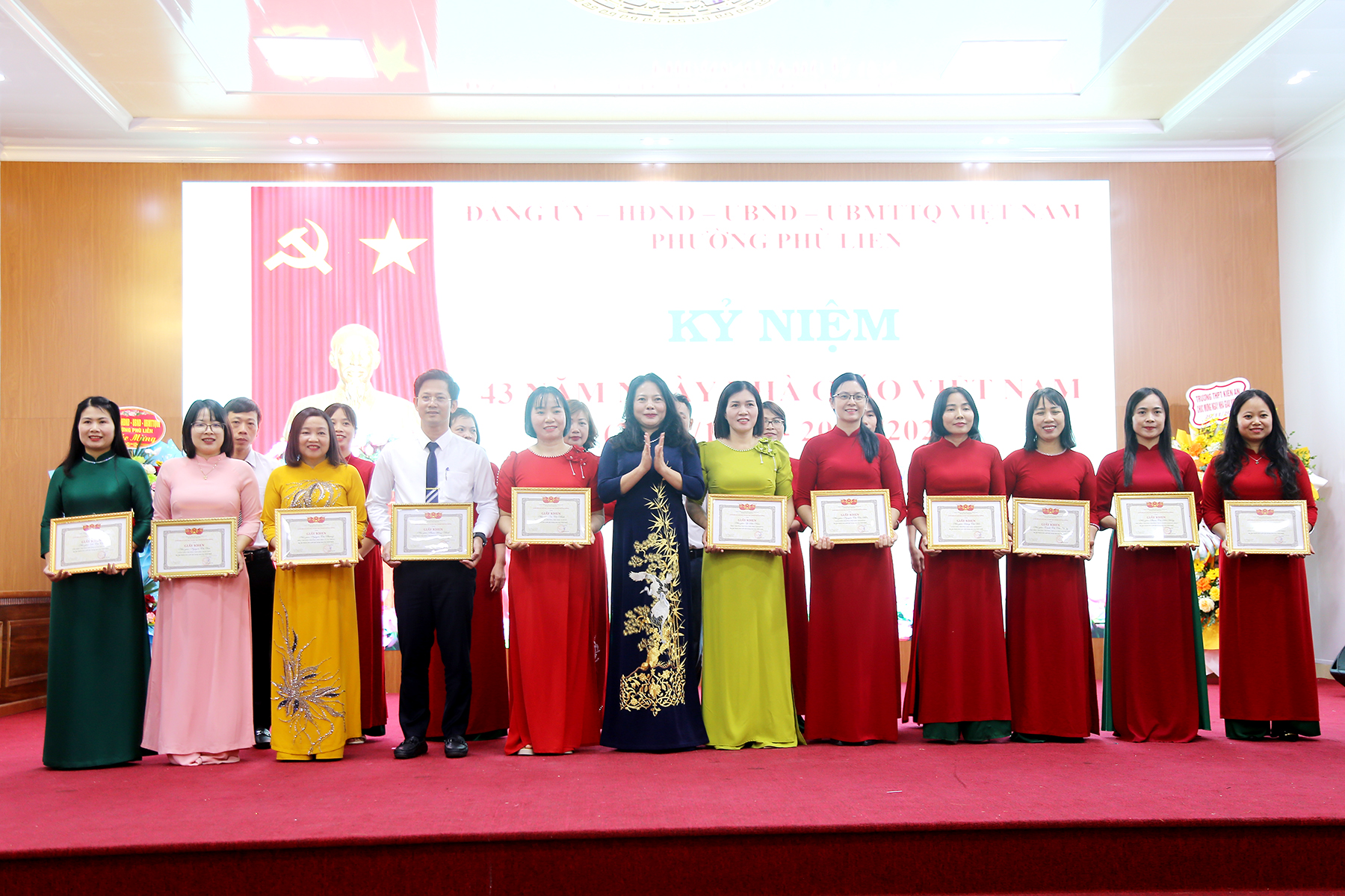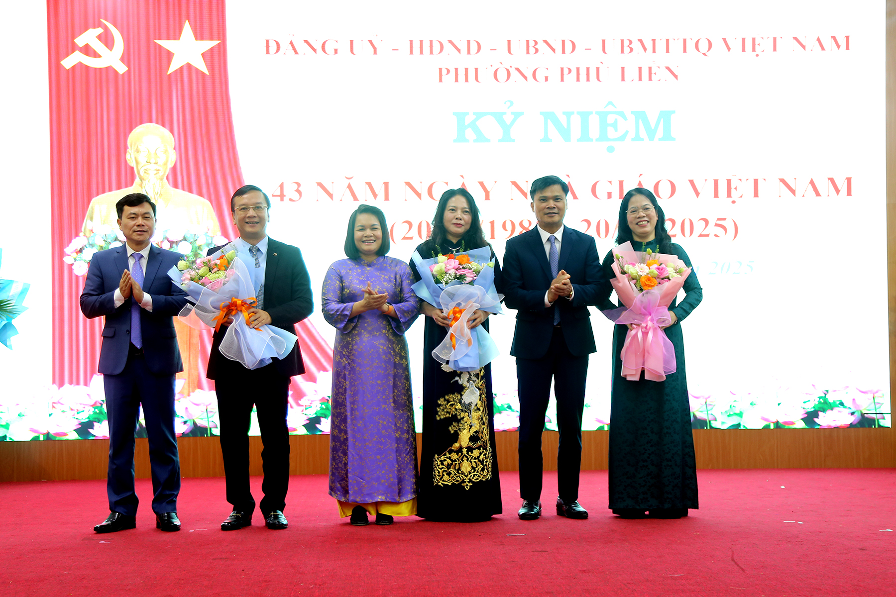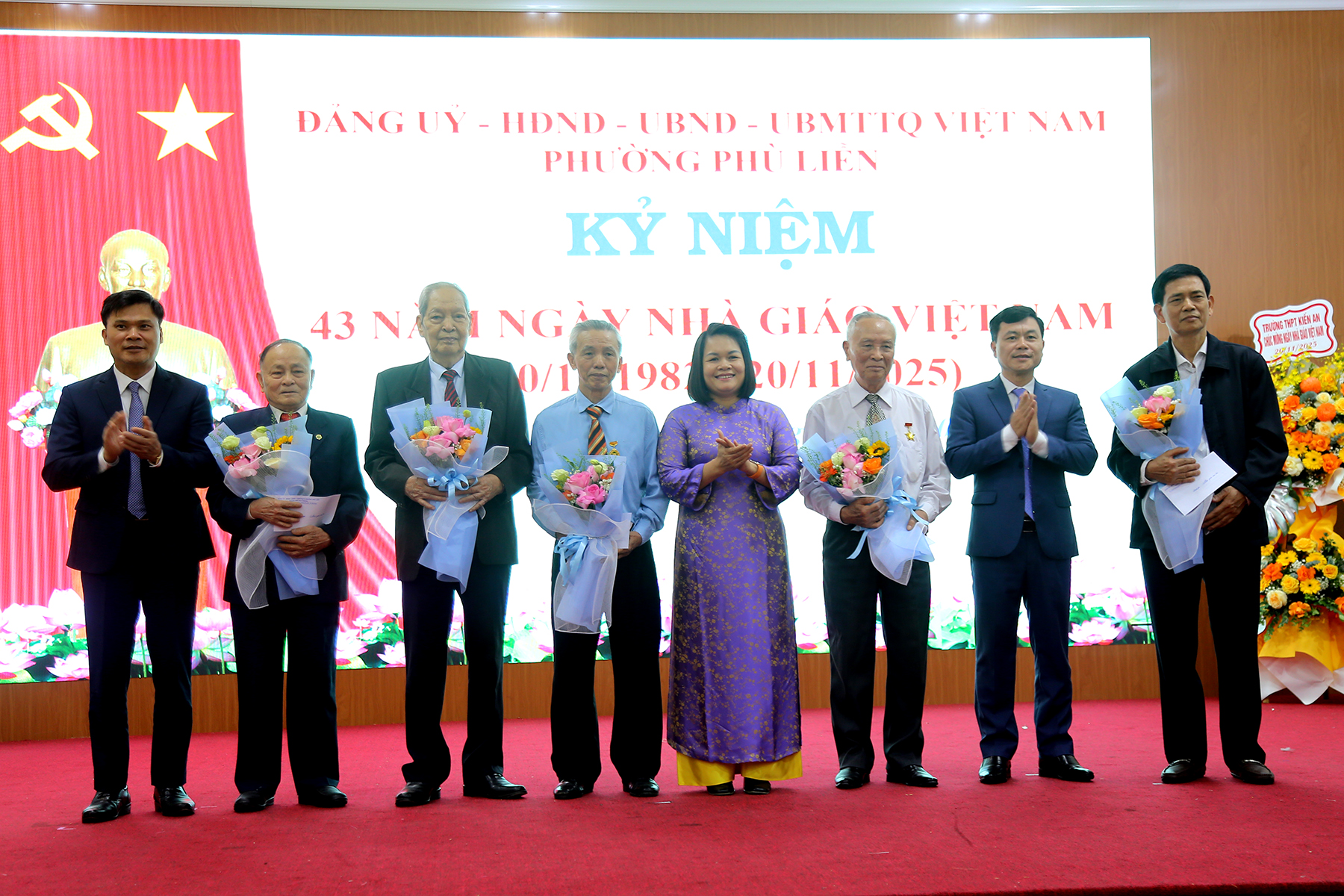(Haiphong.gov.vn) - Chiều 14/11, UBND phường Phù Liễn long trọng tổ chức kỷ niệm 43 năm ngày Nhà giáo Việt Nam (20/11/1982 – 20/11/2025). Tới dự có các đồng chí: Uông Minh Long – Phó Giám đốc Sở Giáo dục và Đào tạo thành phố; Phí Thị Thùy Vân – Phó Giám đốc Sở Giáo dục và đào tạo thành phố; Phó Giáo sư – Tiến sĩ Nguyễn Thị Hiên – Bí thư Đảng ủy, Chủ tịch Hội đồng trường Đại học Hải Phòng. Về phía lãnh đạo phường có các đồng chí: Bùi Thị Tuyết Mai – Bí thư Đảng ủy, Chủ tịch HĐND phường; Phạm Văn Diện – Chủ tịch UBND phường; Phạm Tiến Thắng - Phó Bí thư Thường trực Đảng ủy phường.\