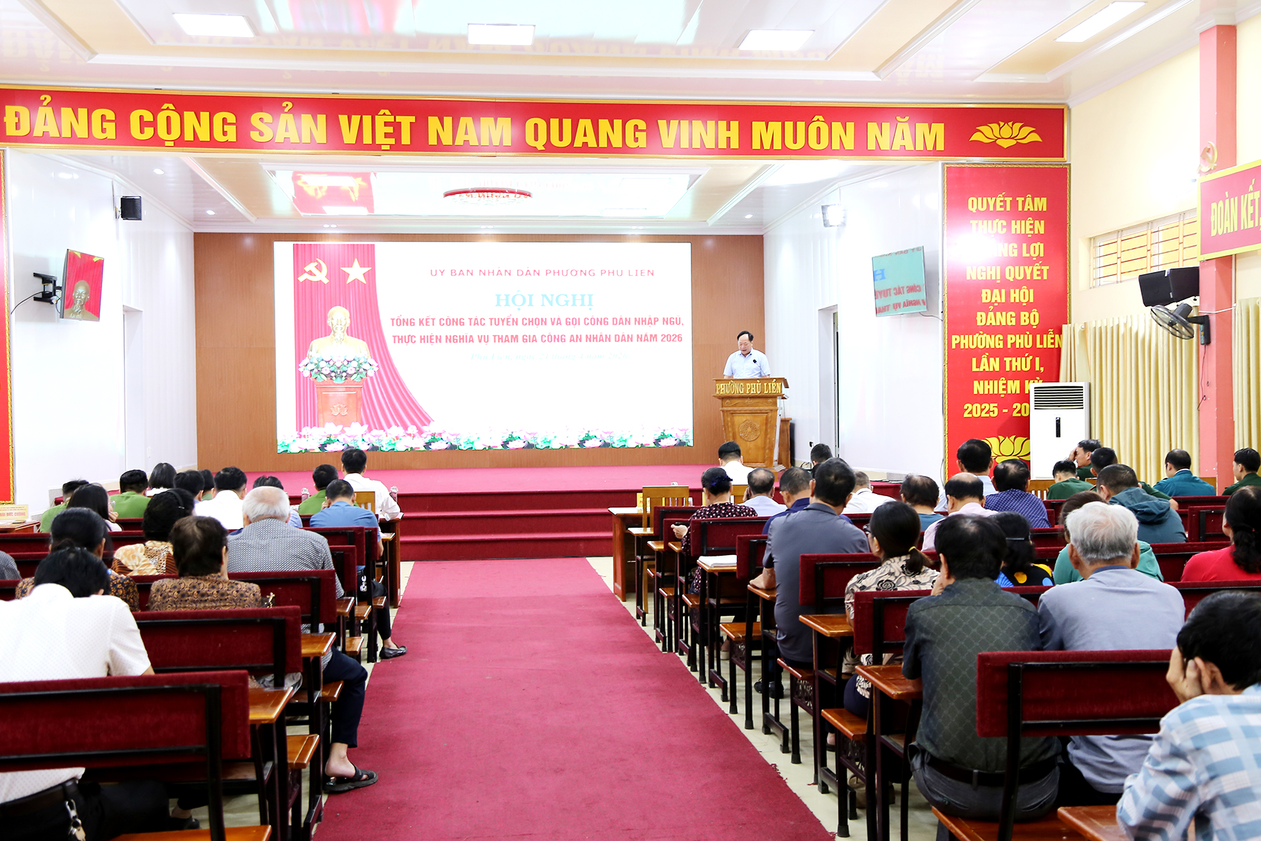 (Haiphong.gov.vn) - Sáng 24/4, UBND phường Phù Liễn tổ chức Hội nghị tổng kết công tác tuyển chọn và gọi công dân nhập ngũ, công dân thực hiện nghĩa vụ Công an nhân dân năm 2026. Dự chỉ đạo Hội nghị có các đồng chí: Phạm Văn Diện, Chủ tịch UBND phường; Phạm Tiến Thắng, Phó Bí thư Thường trực Đảng ủy phường; Hoàng Thị Minh Thúy, Chủ tịch Ủy ban MTTQ Việt Nam phường.