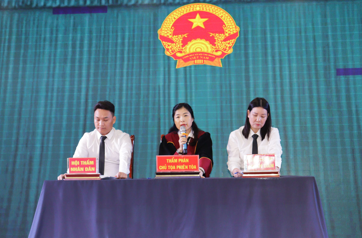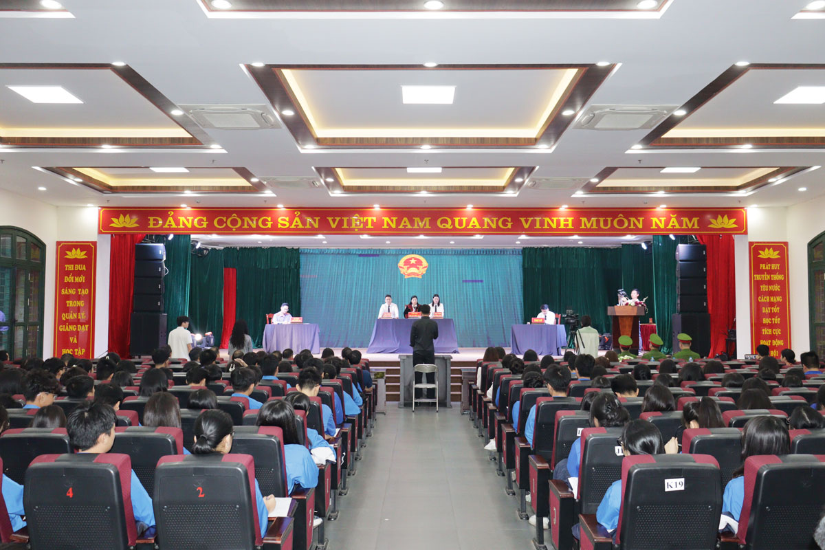 Phiên tòa giả định được kết nối trực tuyến đến các phòng học.Tại chương trình, các đơn vị đã tổ chức phiên tòa giả định kết nối trực tuyến đến các phòng học với hơn 2.000 em học sinh Trường THPT Ngô Quyền theo dõi, với tình huống xử lý vi phạm an toàn giao thông khi giao xe cho người không đủ tuổi. Qua đó, giúp cho các em học sinh nhận thức được những hậu quả nghiêm trọng, sự cảnh tỉnh sâu sắc và mang tính giáo dục pháp luật cao; hình dung rõ nét trách nhiệm của học sinh không chỉ là thế hệ trẻ hiểu và tuân thủ pháp luật, mà còn là người biết lan tỏa đến đoàn viên, thanh niên trên địa bàn thành phố.