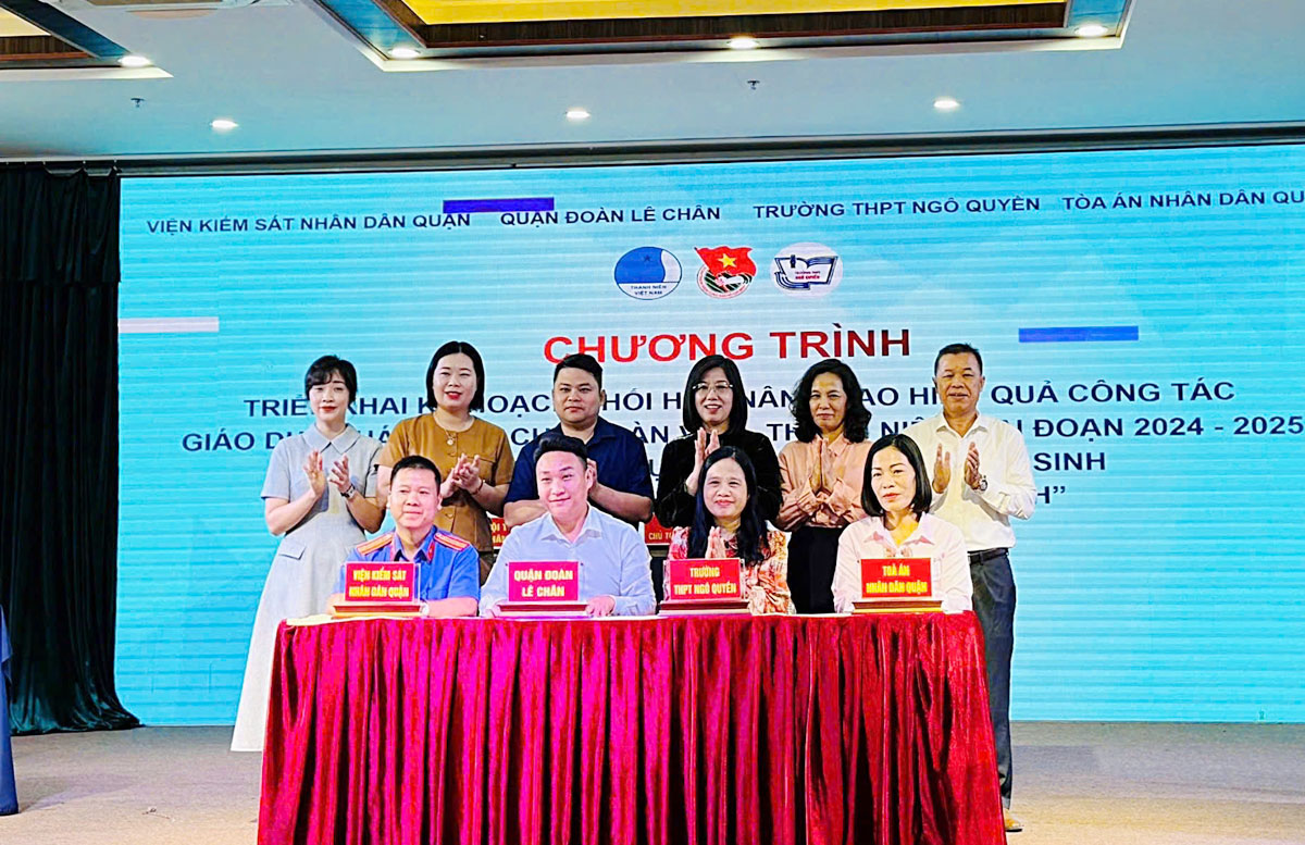 (Haiphong.gov.vn) - Hưởng ứng Ngày Pháp luật Việt Nam (9/11), sáng 6/11, Quận đoàn Lê Chân phối hợp với Tòa án nhân dân quận, Viện kiểm sát nhân dân quận và Trường THPT Ngô Quyền tổ chức chương trình ký kết Kế hoạch “Nâng cao hiệu quả công tác giáo dục pháp luật về an toàn giao thông, phòng chống ma túy, bạo lực học đường cho đoàn viên, thanh niên giai đoạn 2024 - 2025”.