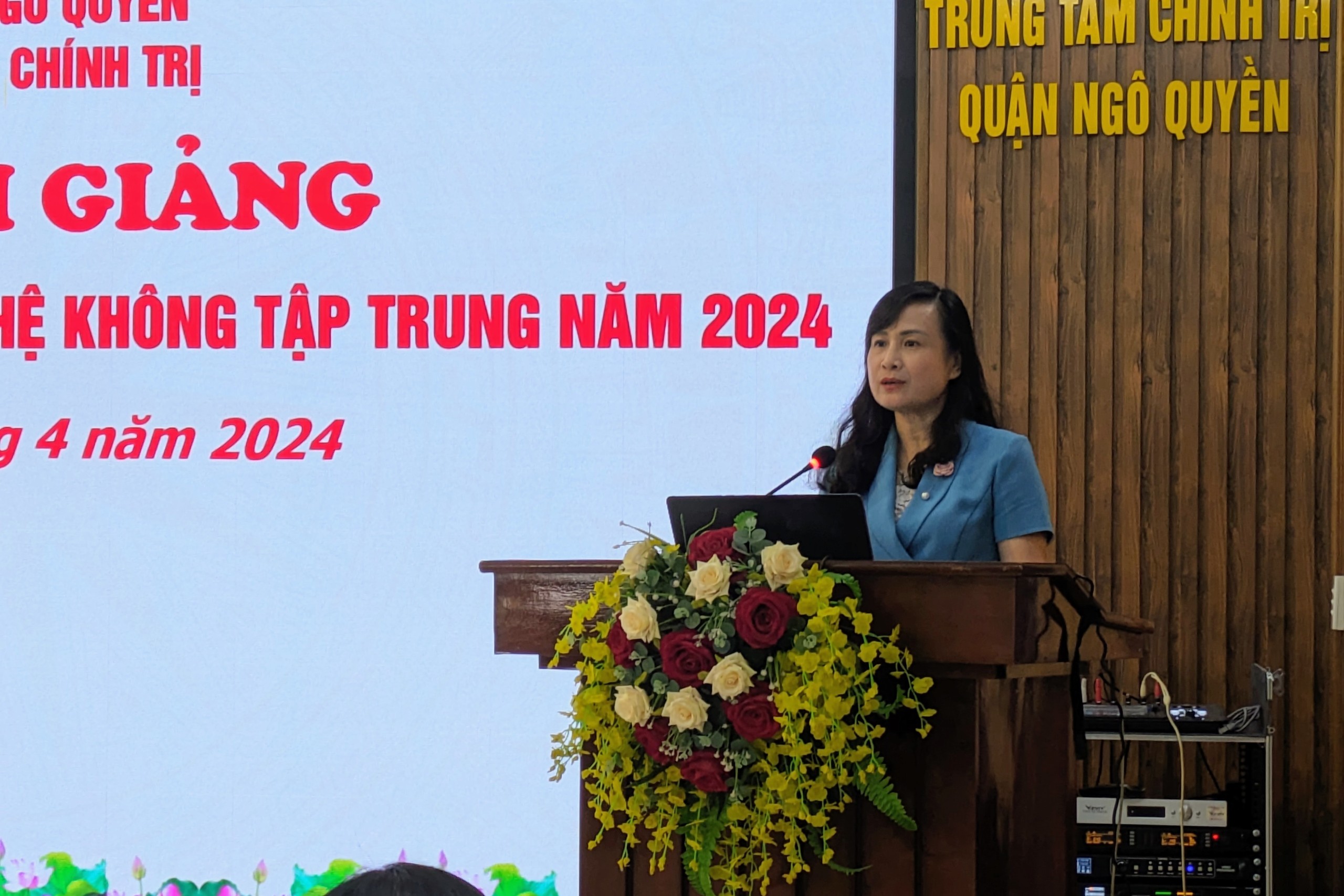 Đồng chí Nguyễn Thị Bích Liên, Trưởng Ban Tuyên giáo Quận ủy - Giám đốc Trung tâm Chính trị quận phát biểu khai giảng Lớp sơ cấp LLLC hệ không tập trung năm 2024 quận Ngô Quyền.Đồng chí Phó Bí thư Thường trực Quận ủy Ngô Quyền đề nghị Trung tâm Chính trị quận xây dựng kế hoạch học tập phù hợp, đảm bảo các điều kiện tốt nhất về cơ sở vật chất phục vụ công tác giảng dạy của giảng viên và việc học tập của học viên. Đối với các đồng chí giảng viên cần áp dụng các phương pháp dạy học tích cực, nâng cao chất lượng bài giảng, các chuyên đề, quá trình giảng dạy cần lựa chọn kiến thức phù hợp, bổ sung, cập nhật những kiến thức mới, chú trọng việc vận dụng, liên hệ với thực tiễn loại hình tổ chức cơ sở đảng, với đặc điểm lực lượng Công an nhân dân để giúp học viên dễ học, dễ hiểu, dễ nhớ, chủ động tiếp thu bài giảng và vận dụng những kiến thức vào thực tiễn công tác, đời sống. Đối với các đồng chí học viên cần nêu cao tinh thần trách nhiệm, tích cực, ý thức tự giác học tập, tích cực trao đổi, thảo luận với giảng viên về những vấn đề cần nghiên cứu, những vấn đề phát sinh trong thực tiễn cần giải quyết./.