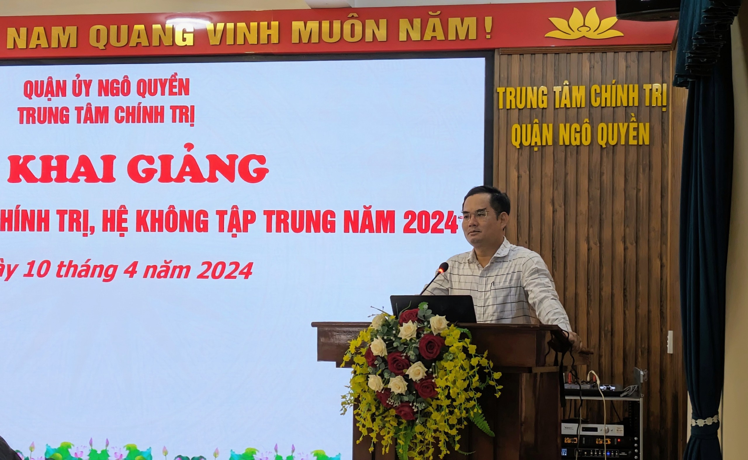 Đồng chí Trịnh Quang Trường, Phó Bí thư Thường trực Quận ủy Ngô Quyền phát biểu tại Lễ khai giảng.Phát biểu tại Lễ khai giảng, Phó Bí thư Thường trực Quận ủy Ngô Quyền Trịnh Quang Trường nhấn mạnh, thời gian qua công tác đào tạo, bồi dưỡng đã góp phần quan trọng thực hiện mục tiêu đào tạo, bồi dưỡng đội ngũ cán bộ, đảng viên trong hệ thống chính trị của quận đủ phẩm chất, năng lực, trình độ, ngang tầm nhiệm vụ đáp ứng được yêu cầu trong tình hình mới. Điều này càng có ý nghĩa khi học viên Lớp sơ cấp LLCT hệ không tập trung năm 2024 của quận Ngô Quyền đa số là cán bộ chiến sỹ CAND, việc được trang bị, bồi đắp kiến thức LLCT sẽ góp phần công tác tốt, đóng góp xây dựng lực lượng Công an nhân dân có đủ khả năng, sức mạnh phục vụ hiệu quả các mục tiêu, nhiệm vụ cách mạng của thành phố và đất nước trong giai đoạn mới.