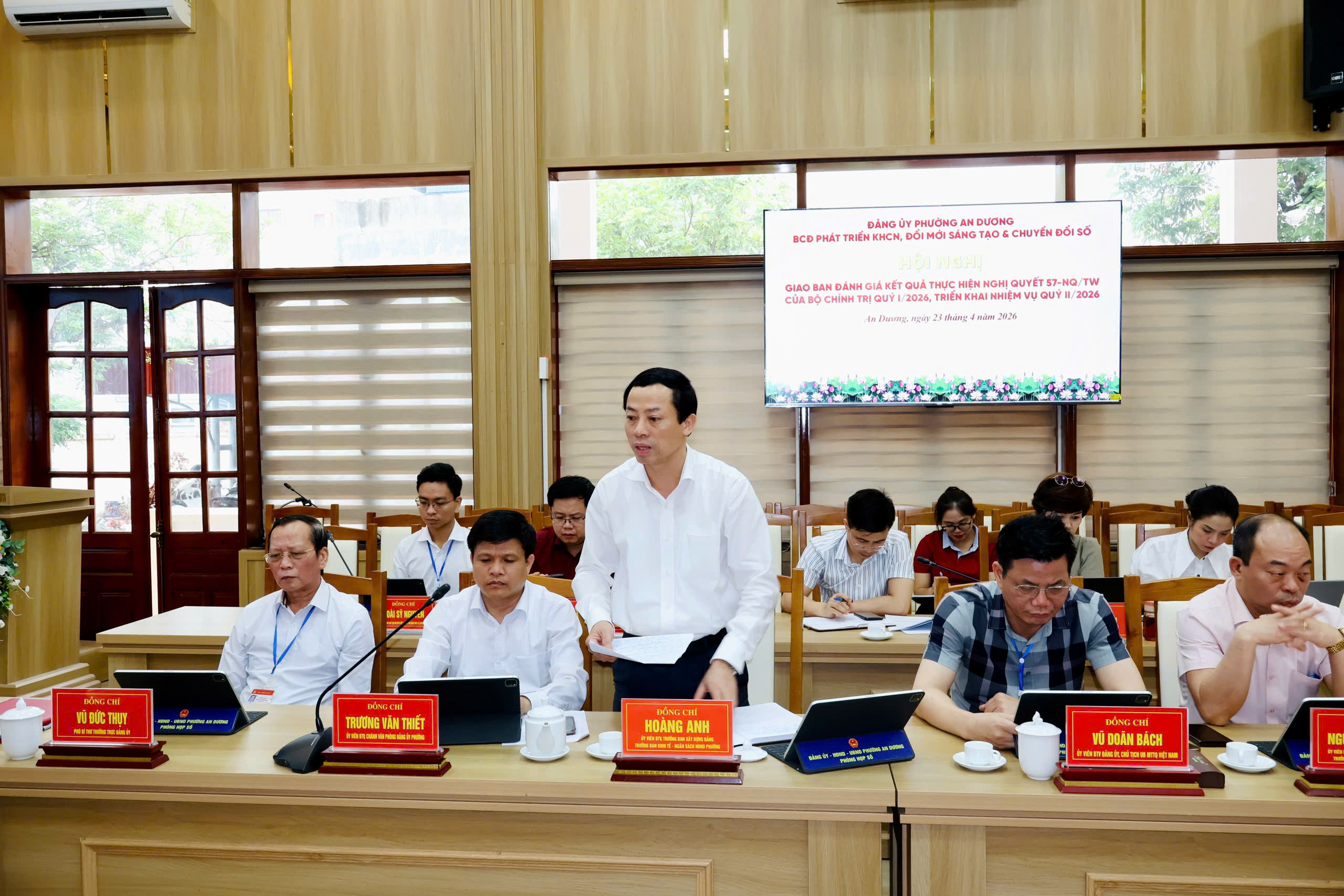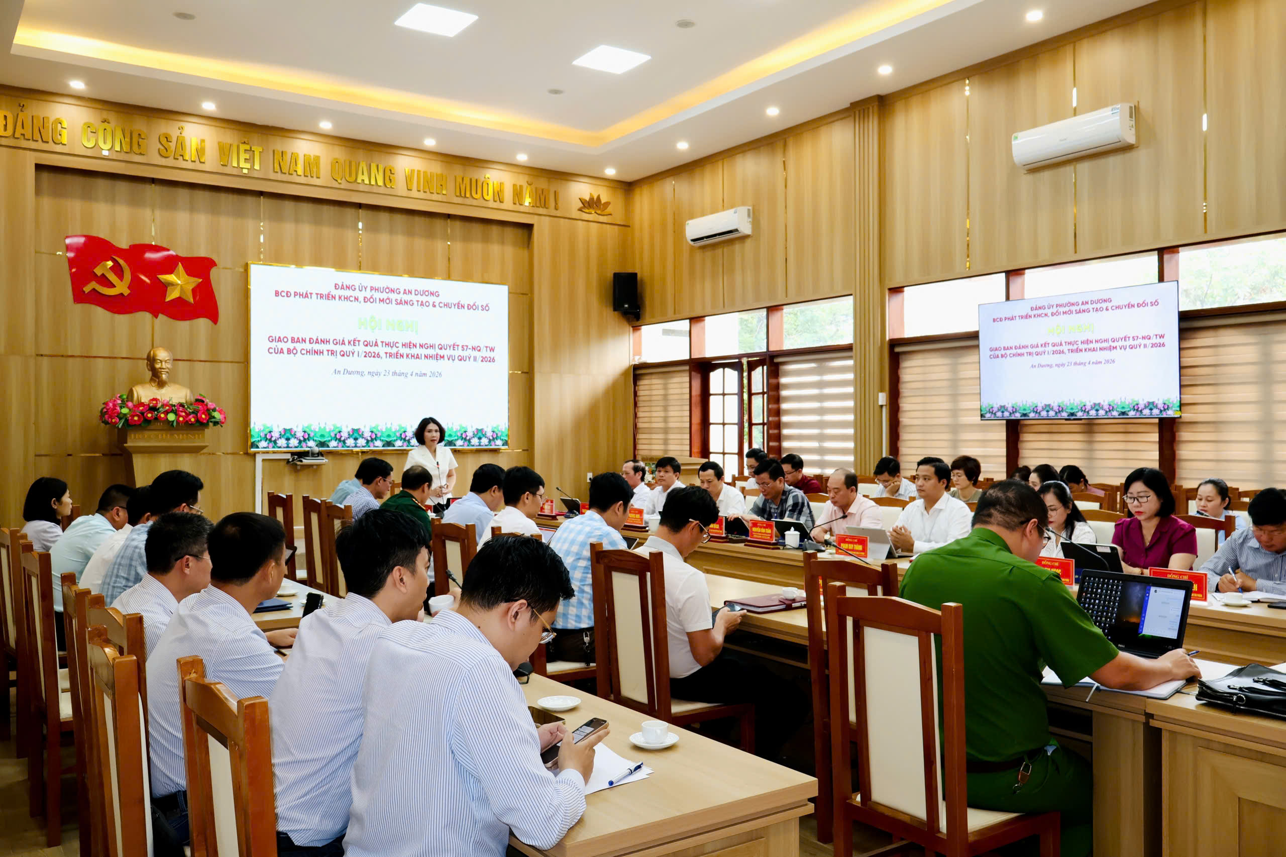 (Haiphong.gov.vn) - Chiều 23/4, Ban chỉ đạo về phát triển khoa học, công nghệ, đổi mới sáng tạo và chuyển đổi số phường An Dương tổ chức Hội nghị đánh giá kết quả thực hiện Nghị quyết số 57-NQ/TW của Bộ Chính trị về đột phá phát triển khoa học, công nghệ, đổi mới sáng tạo và chuyển đổi số quốc gia quý I và triển khai nhiệm vụ quý II/2026. Đồng chí Bùi Thị Hồng Vân, Thành ủy viên, Bí thư Đảng ủy, Chủ tịch Hội đồng nhân dân phường, Trưởng Ban chỉ đạo chủ trì Hội nghị.